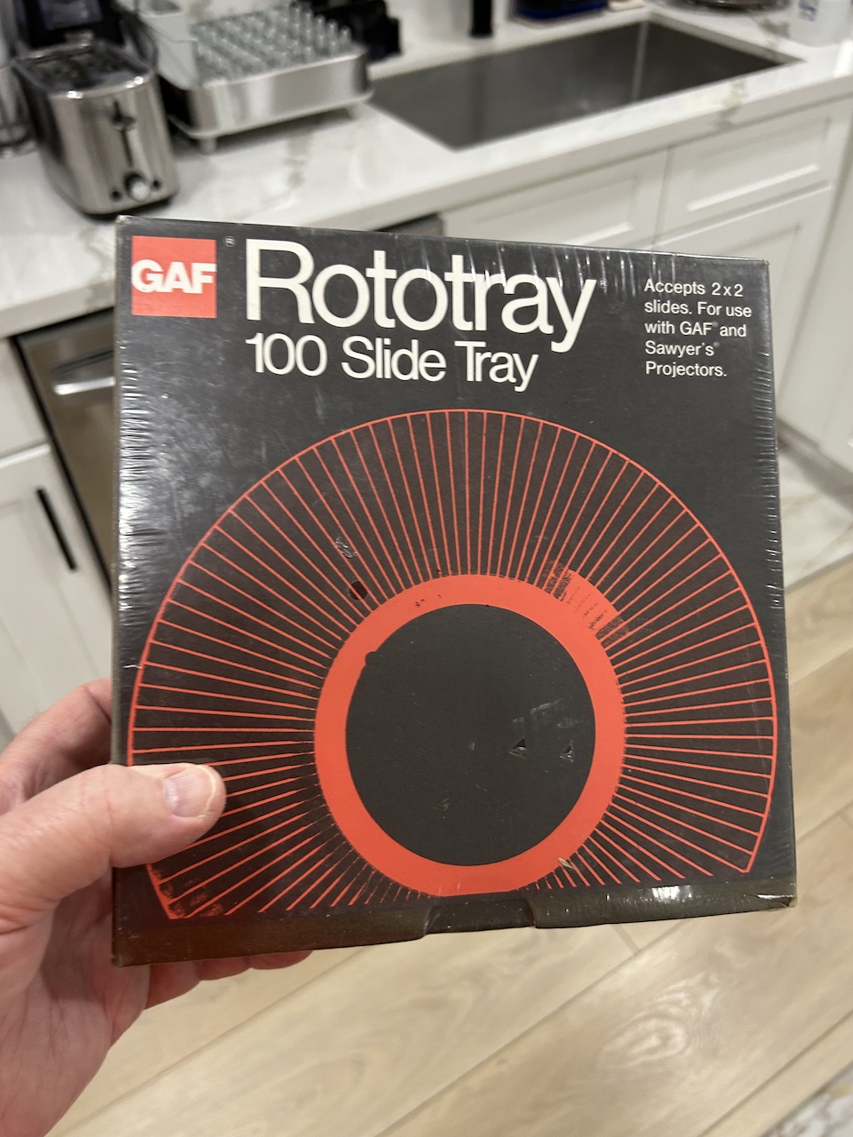 GAF Rotary Slide Tray - New, sealed. I believe I purchased this some time ago for use on my Vivitar autofocus slide projector. I think this is what is called a Sawyers-type tray, and they are very effective in use IMO. These fit several slide projectors other than Sawyers such GAF and Vivitar projectors (and I'm sure there are others). Price: $8 plus shipping