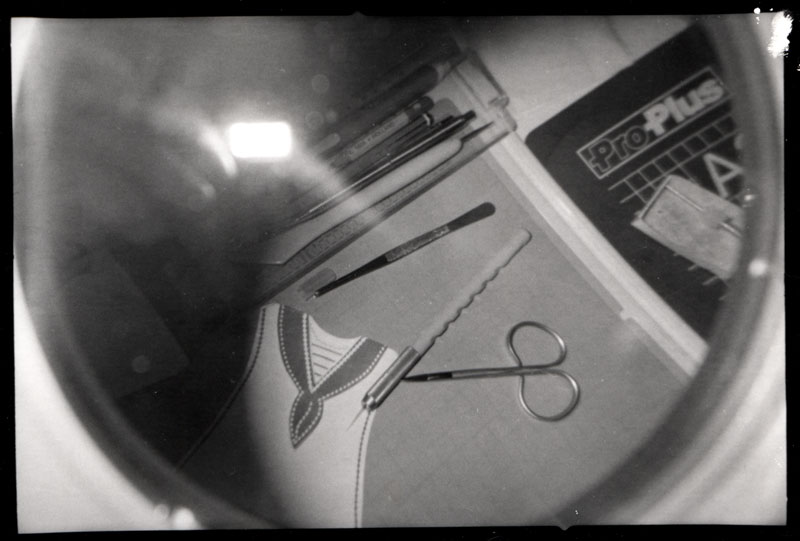 Hobby table from my wife + build-in flash through a magnifying glass. Found this old Motor Vehicle Accident Report camera onder my spare wheel (for free included the insurance papers) and inside a 200 asa Italian colorfilm. It was there for a loooong time. Film developping in HC110 B&W developper random for 8 minutes 1+25 and printed on old agfa premium color- Black and White paper(old paper bulkroll also a gift) in the dark. I LIKE THIS TOPIC!