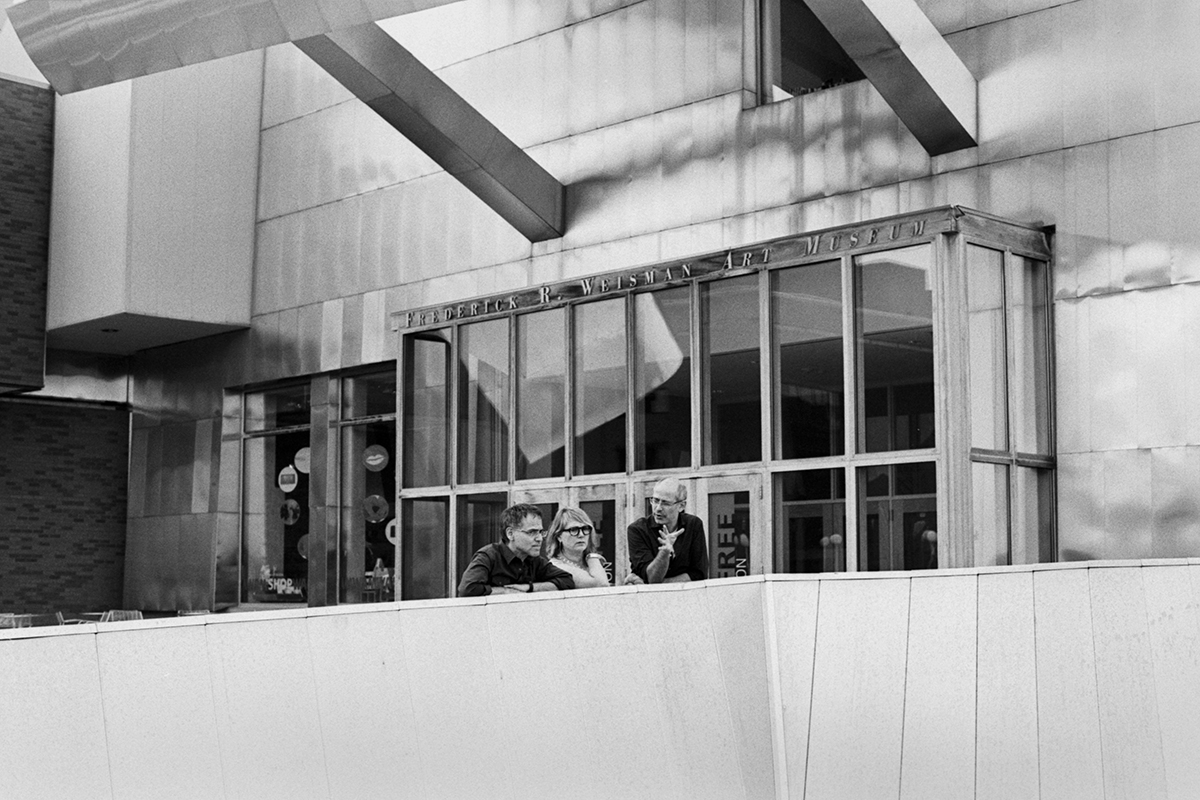 The Frederick R. Weismann Museum on the University of Minnesota Campus is a beautiful building designed by Frank Gehry. In the lull of the summer semester, when most students have taken time off, I visited the museum together with some friends and Heidi, my better half, and here they are seen discussing something I couldn't overhear, but I liked how they were placed in the frame.