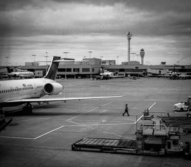 This was taken at the beginning of a business trip to Detroit the first week of July. I can't remember the airport and didn't bother to check my developer when I developed the film only to find out there was all kind of specs of junk in the developer. Hence, spots and scratches galore. The lomo crowd should love it. :D The developer also did some nasty things to the edges of the film so I added a little vignette....one defect attempting to cover up for another.