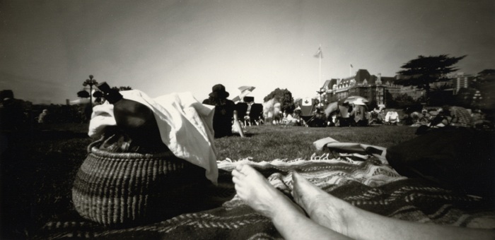 I took this as the crowds were gathering on Victoria's legislature lawns for the Symphony Splash. By the time the concert started, ALL the grass was covered with blankets, chairs and people. Holga wide pinhole, PanF.