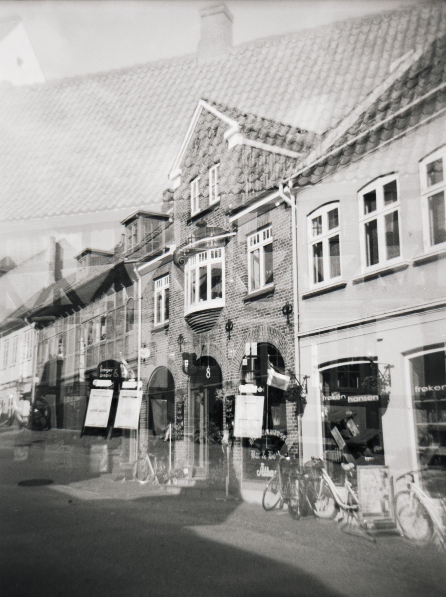 The first is a double exposure made in the main street of the friendly town of Bogense, Fyn, Denmark. The faint double image is from one of the oldest "kro" (inn) from Denmark called: Erik Menveds Kro. The walls are still made of wood and clay. It's a very old place (established in 1543), also designed for people to gather.
