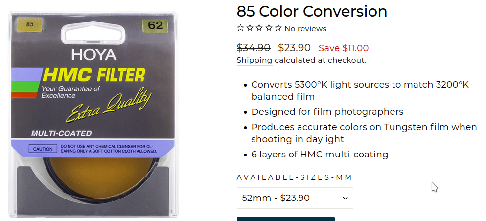 There is a bit of confusion with these filters. Technically, the "correct" filter is 85B, which warms from 5500K to 3200K, as tungsten films are balanced. And the filter 85 without a letter warms up to 3400K. In reality, 200K is not much, and daylight varies in a very large range depending on the atmospheric conditions and the time range. But in many places it has become a household name when it says "filter 85", in fact it is about 85B.