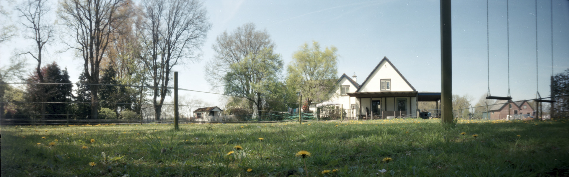 The hand-cut glass plate negative was hand-coated with a homemade emulsion, which I test to be rated at ~ ISO 0.5. At EV 14 (the grass in this picture), the exposure is 3 seconds at f/16. Taken on July 2nd, 2016. EV 16 on the whites (the top of the play structure is actually blue), and EV 9 or 10 in the shadow. So the emulsion has a very steep contrast curve, as to be expected. Surprised the kids stood still.