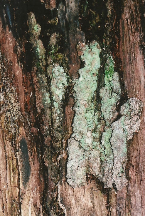 Tree bark: I see (from left to right in the green areas): a little dog with a black nose, two people fighting on top of a mountain, a Japanese woman in Kabuki costume and finally a clown leaning forward with big clown shoes. If you look carefully, you will see them too!