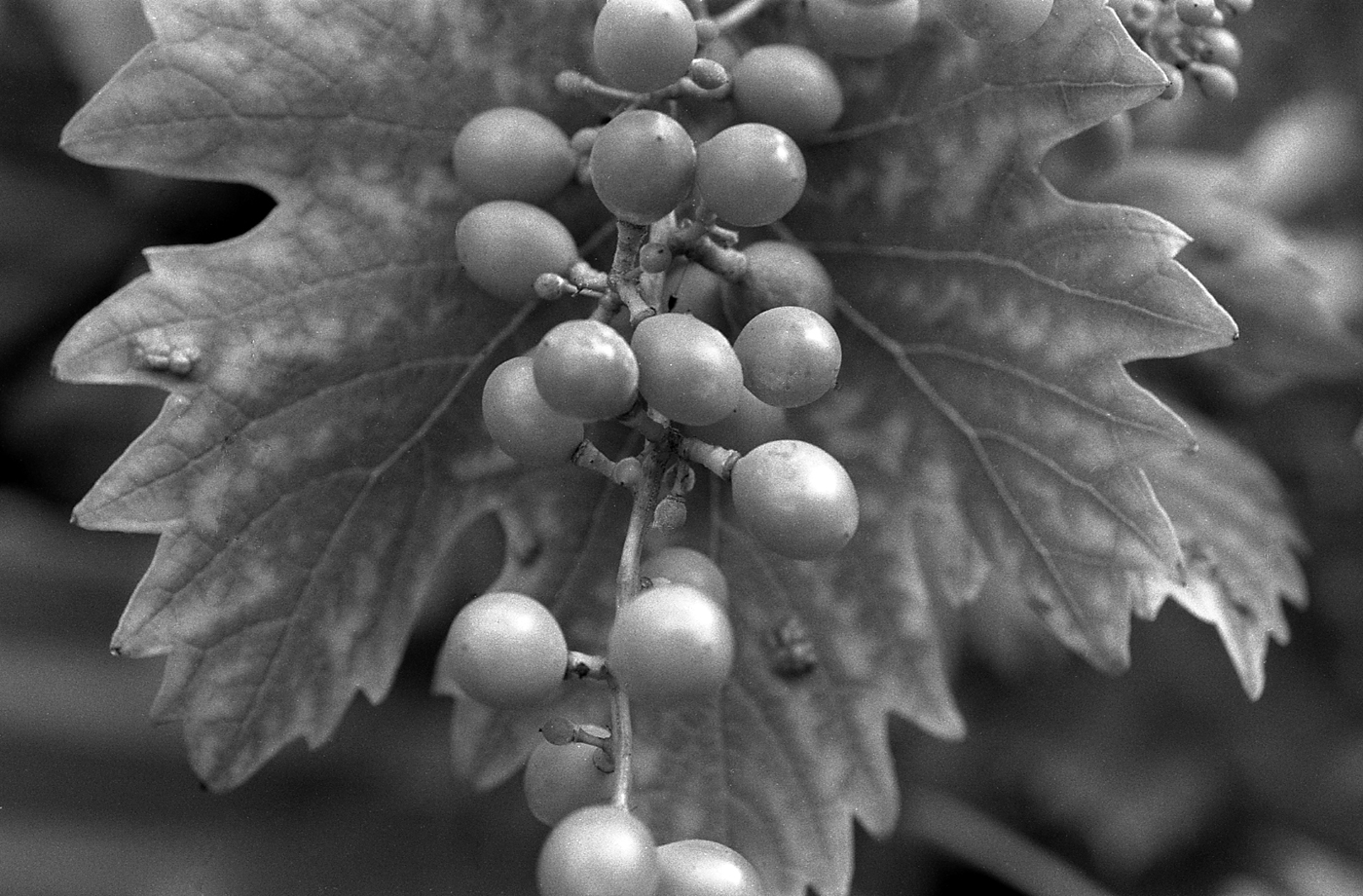 Little grapes in our backyard. Pentax LX and 50 mm macro at 1/500 - f 2.8 by hand, Kodak TMX 100, dev, HC 110 dill B 6,5 min.