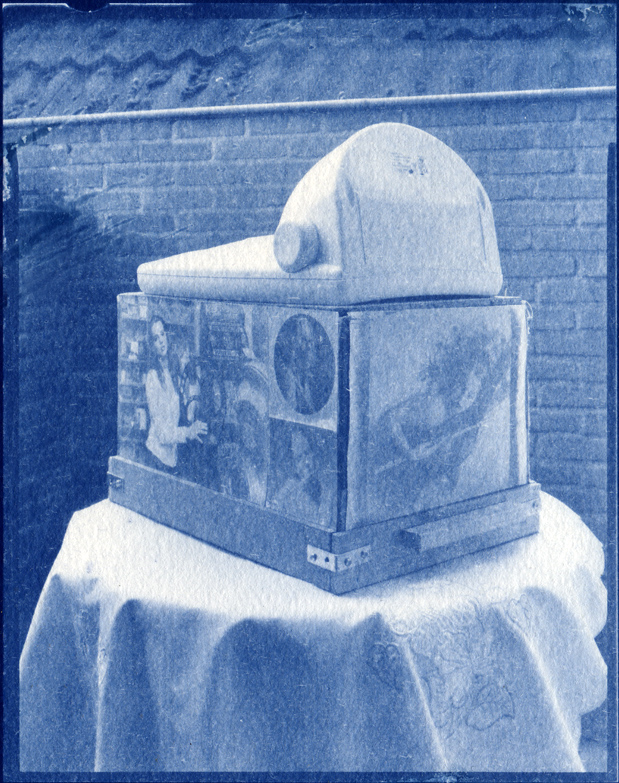 Image 1 - UV light setup complete from trash, with light, potato lightbox decorated with own prints, (4x5" ADOX 100 asa 1/2 sec f32 in HC 110 - 9 min,) Contact 4X5 on self prepared. cyanotype aquarelpaper, 6 min exposure time with this lightbox, 5 min development in water.
