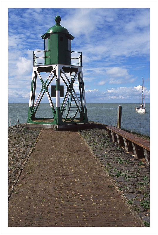 On two nearby piers are a red and a green cast-iron light beacon for the Stavoren harbor.