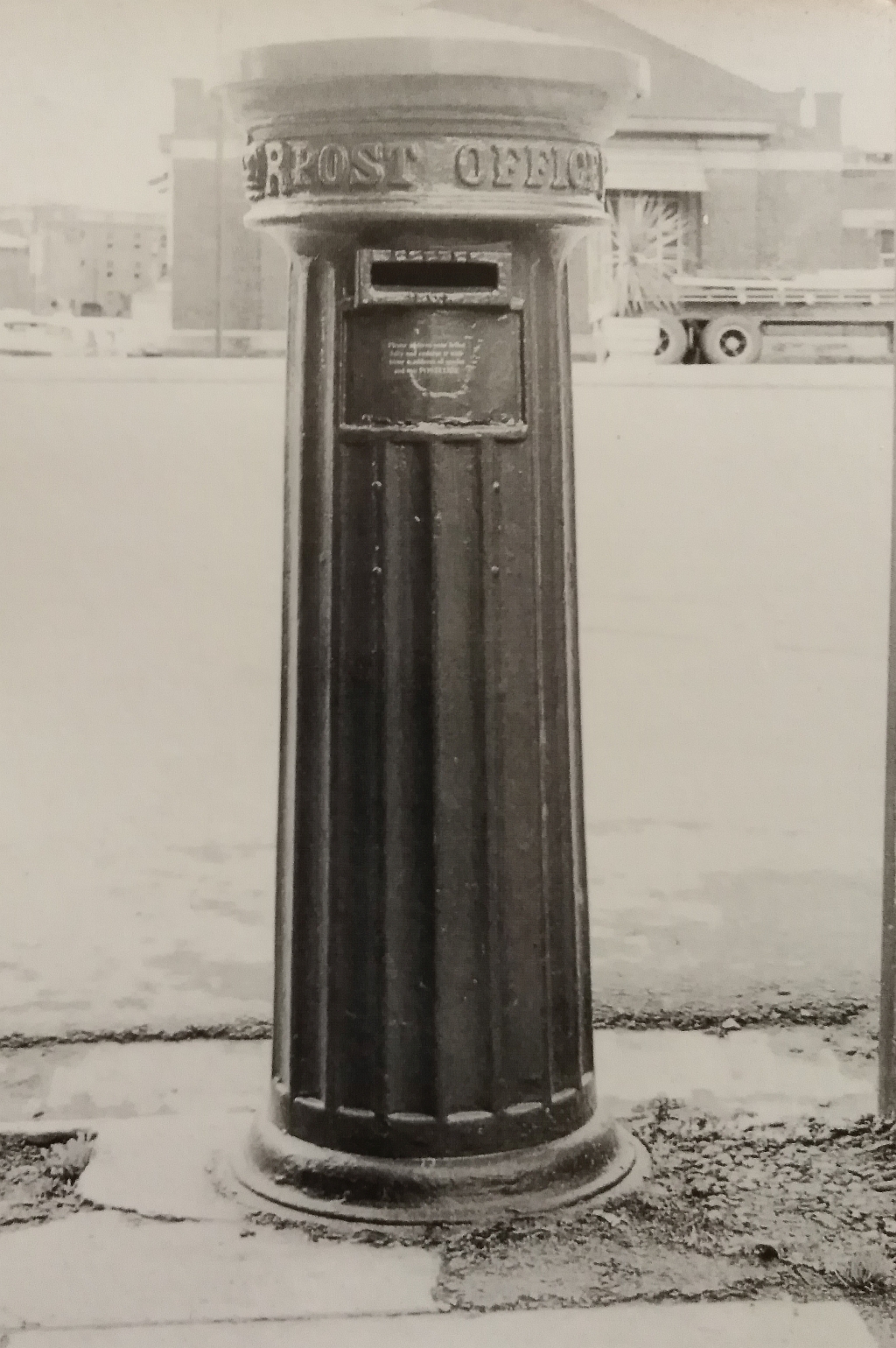 Going on the wheels on the semi-trailer parked in the background, this is a recent photograph. This is a posting box I'm unfamiliar with, although I have a suspicion I may have seen posting boxes like this in the 1950's.