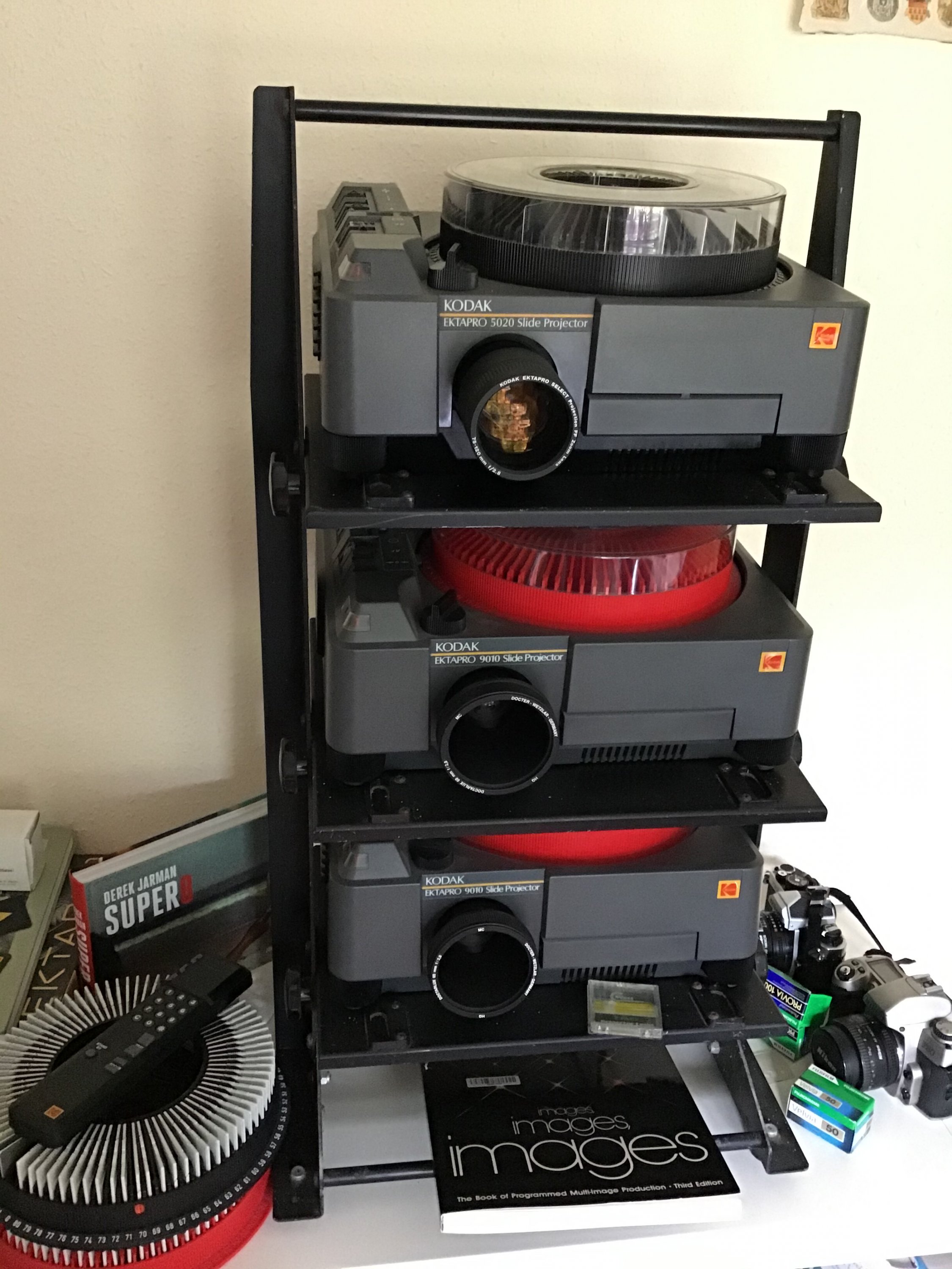 The Ektapro 9010 is a great projector and when coupled like this it can dissolve anywhere from a hard cut to ten seconds, it can support parallel projection, switching between projectors without forwarding the slides and fully automatic, continuous projection. However, it cannot support for example ten slide dissolves followed by parallel projection followed by hard cuts. For that I need a machine that can command the projectors.