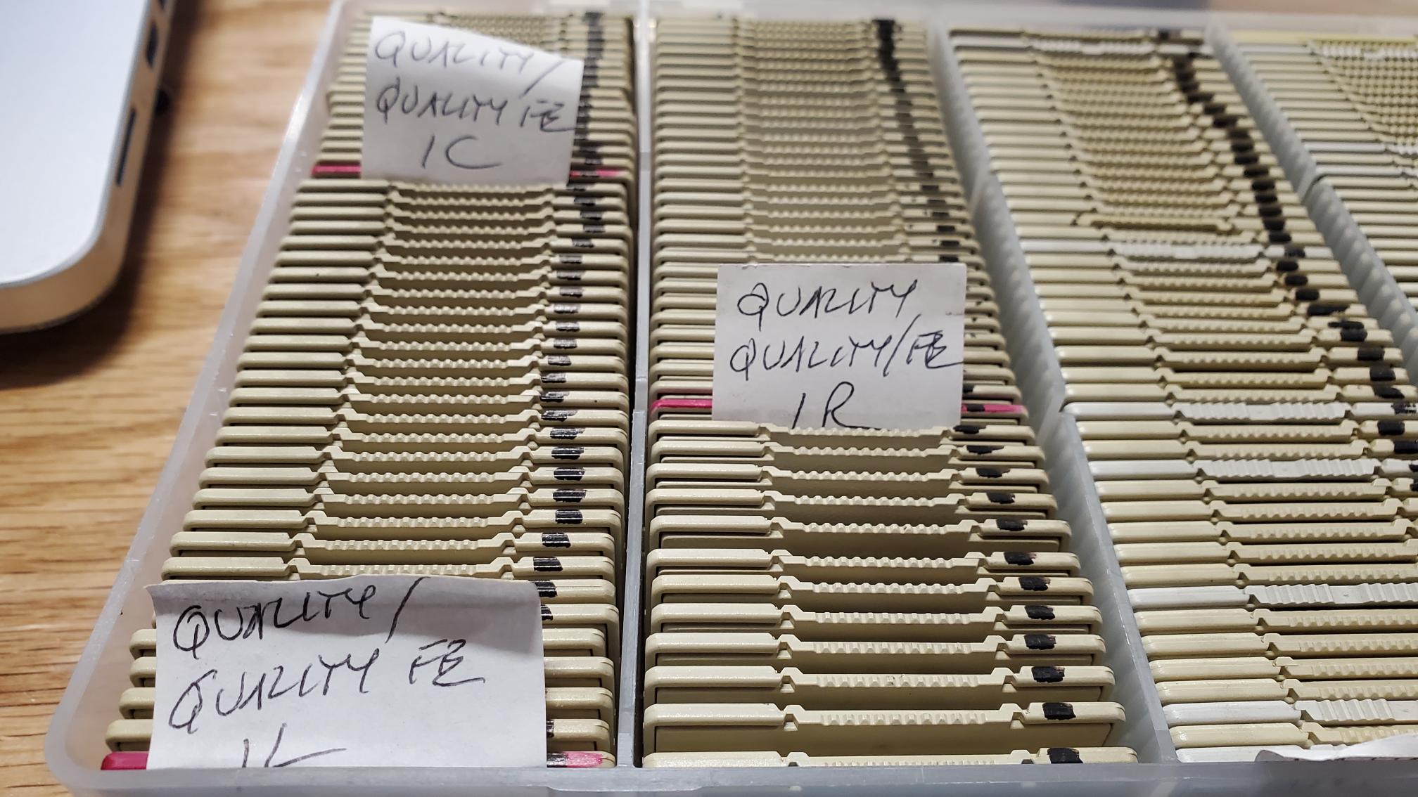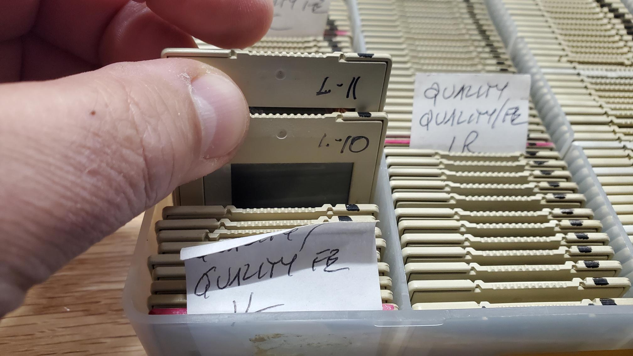 The slides for each tray are identified with a bit of paper. For some of the shows, the slot and tray # was already written on each slide, but that's not always the case. So, it is imperative to carefully pull each slide out of the box, in order, and drop into a tray, in order. See the pics of a typical box. The show in the illustration is only a 3 projector show.