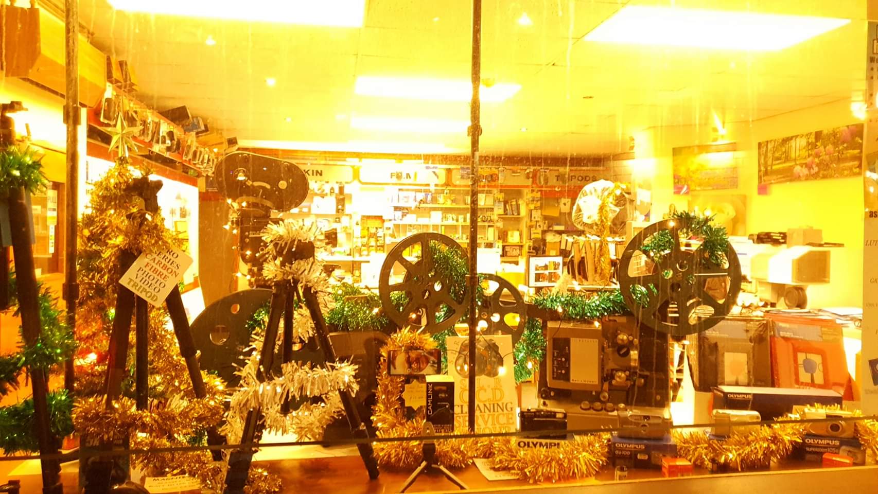Here is how my local shop trimmed up their front window display for Christmas. the two 16mm projectors were brought up from the basement and within a week offers had been made for them. As the shop owner is unsure if they're working they are, for now, just for display. They're still there, sans tinsel, and there are now more Olympus compact 35mm cameras in the window.