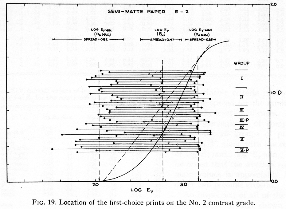 I think this example is good at illustrating the last two points. It shows the negative density ranges of prints that were judged as being of high quality laid over the characteristic curve of the paper they were printed on. While there is a certain pattern, there is no strict and precise rule.