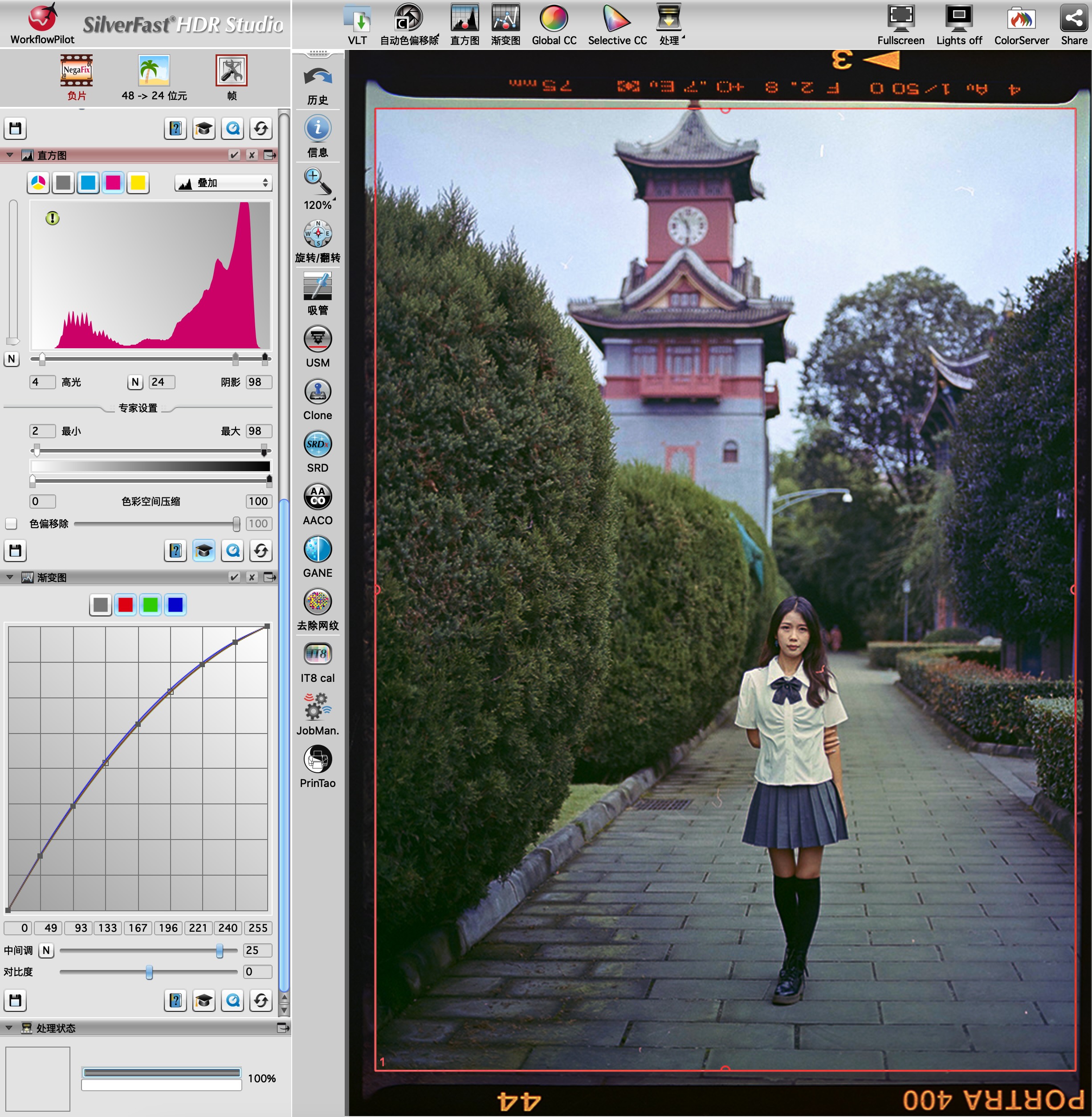 Note that there is still severe color crossover on this scan likely due to uneven illumination. There are yellow and blue spots all over the negative. Note how the bottom of the white shirt is yellow while the top tends towards cyan. Likewise, the entire top of the frame is very blue. The floor on which the model stands is bright blue on the left side and and yellow/tan on the right side. The entire bottom left corner is very blue, which is not just due to the lighting/shade. There are still issues to sort in the scanning process.