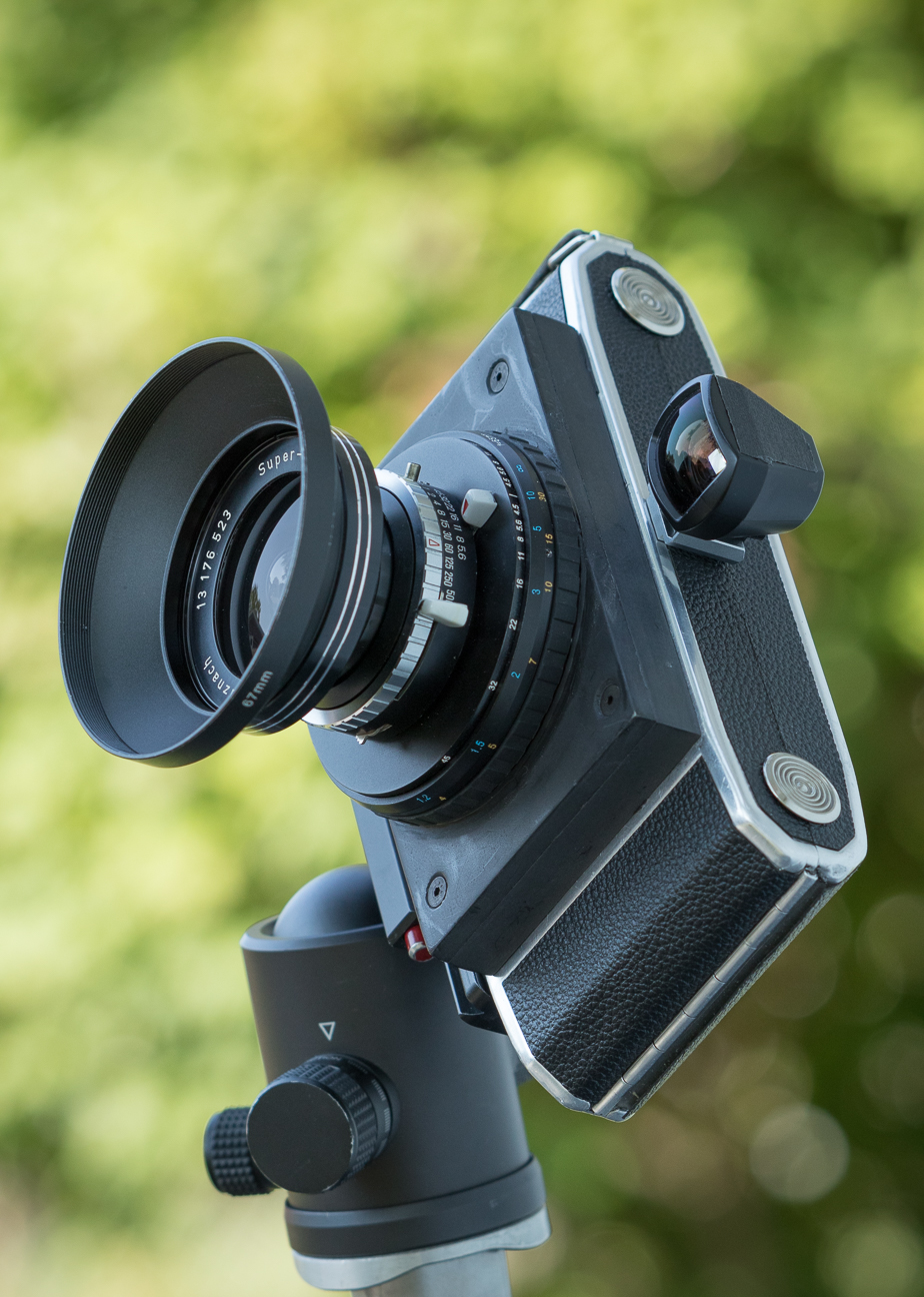 After finishing my 520/15 Zeiss Ikonta with a fixed 47mm Super Angulon a couple years back, I almost immediately started building a companion camera with a less extreme 65mm in a focus mount. I had planned on using the original Zeiss focus mount for the 65mm f/5.6 Super Angulon but after taking it apart to clean out the 50 year old grease, I could not get it back together. I sent it to camera repairman extraordinaire Bob Watkins at Precision Camera Works who thought it might ever so slightly bent as he too could not get it back together. Not wanting to use one of the cheaper plastic eBay helicals, I opted for a Fotoman helical which (despite it large size) is amazingly smooth and solid to operate. I originally planned a more compact (and attractive) spacer but the larger helical required a very functional albeit unattractive box style spacer to get the focus perfect. As always I enjoyed the process and the problem solving, especially glad I sent it to a leather guy and had the camera recovered after stripping the old paint and leather. Enjoy!
