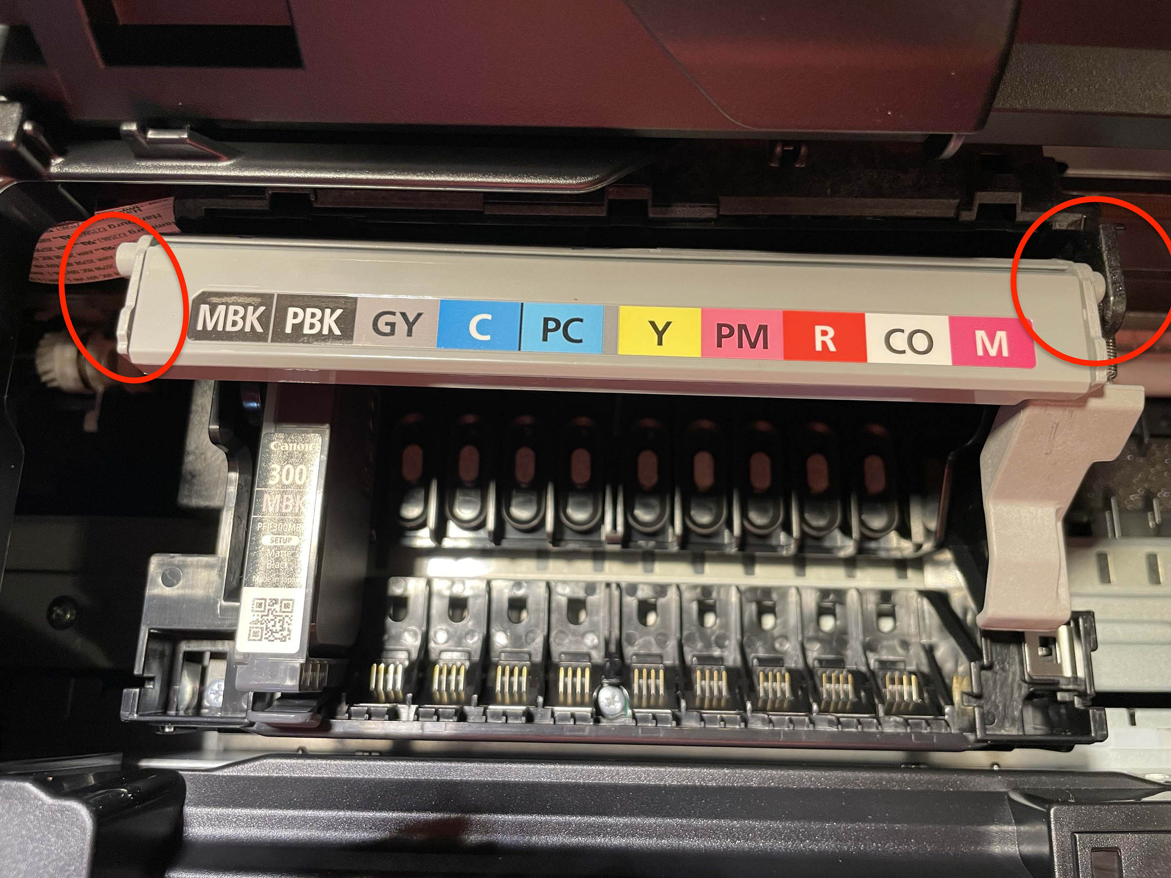 I'd appreciate any help here. The print head lock only has a bracket on the right side (as I face it)--the side with the spring--and nothing to hold it in place on the left side. Seems like the spring creates tension that will make it easy for the lock to be unlocked. Is this the way it's supposed to be? Seems like the ridge on the left side might be a little rough, and I'm wondering whether a piece of plastic there broke off. (Can't see an odd peice in the printer or box.) Seems counter-intuitive, but maybe the ink cartridges hold it in place? I'd like to determine this before installing all the cartridges, in case I need to return it. Thanks for any help.