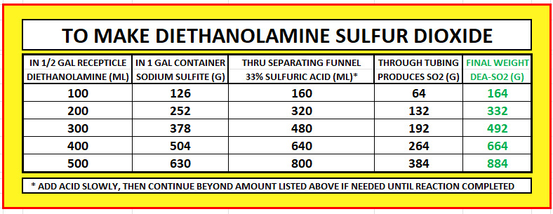 Sulfuric acid 33% slowly added to sodium sulfite (first bottle) in a closed system. Bubble it through a 99+% diethanolamine (2nd bottle). Third bottle is a scrubber that captures any overflow SO2 so there’s minimal release. Takes a few hours on a Saturday afternoon the grad cylinder shows the final result View attachment 335044View attachment 335045
