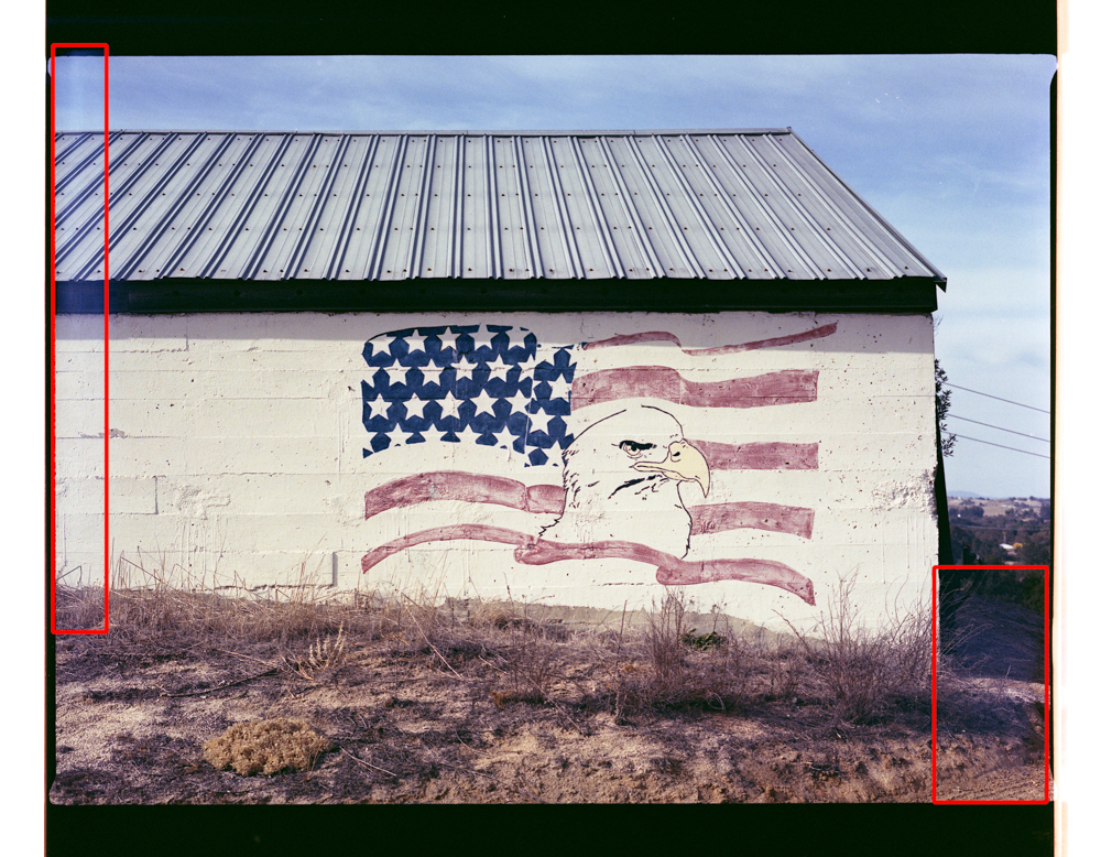 This looks more like a scanning artifact. Can you see greenish stripes on the negatives themselves in these places?2). Magenta coming in on the top and bottom of the neg (both images rotated 90º in Lightroom after scanning). Appears in both SF and Epson Scan, with neg rotated and moved into different positions. There is no density difference or obvious defect in the area on the neg itself (film is Ektar):