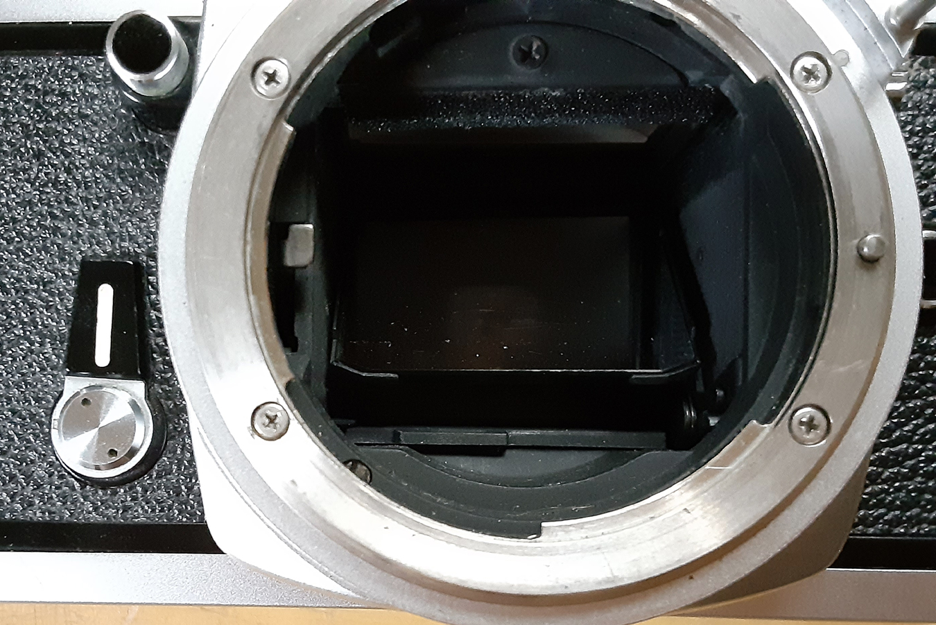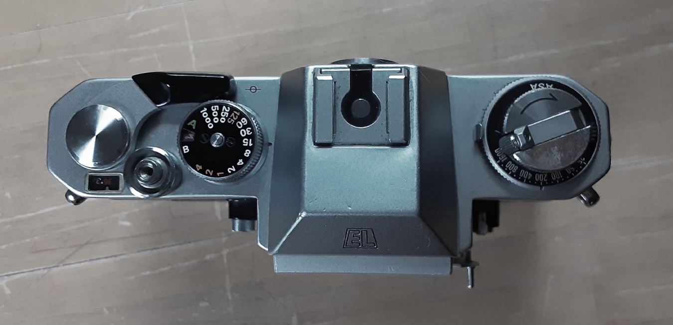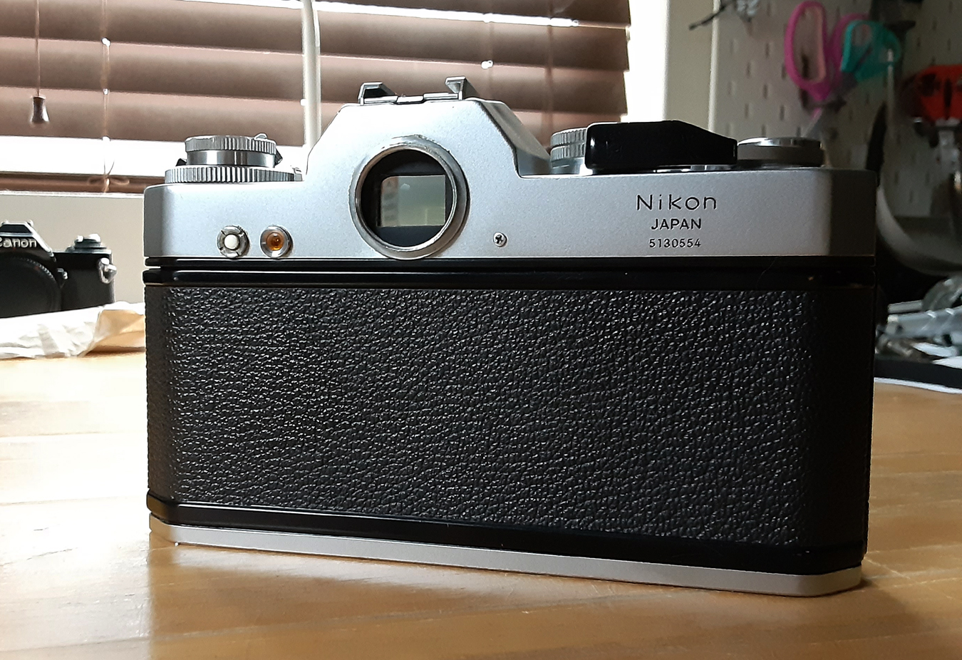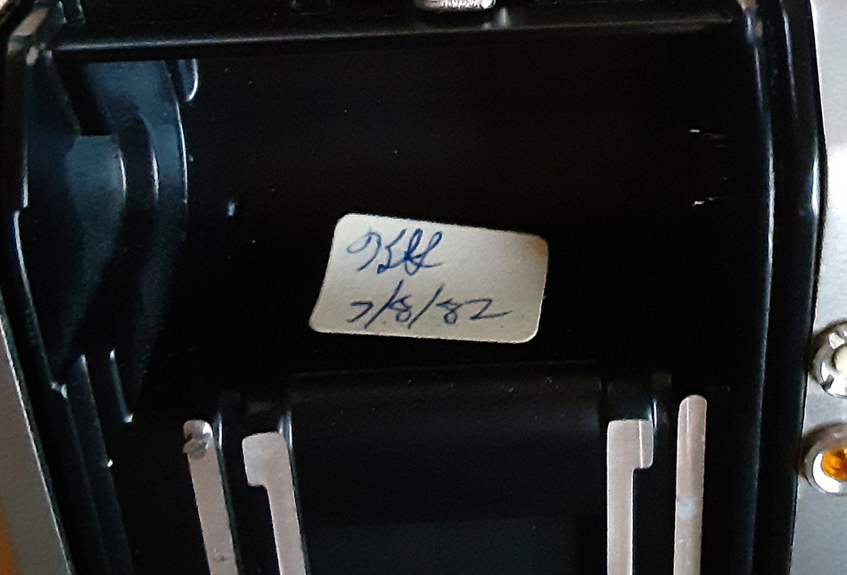 This was last serviced in 1982, which by Nikkormat standards makes it a recent service. There's a small dent on the prism and one half of the rewind knob is showing corrosion. Otherwise, an attractive and clean camera.