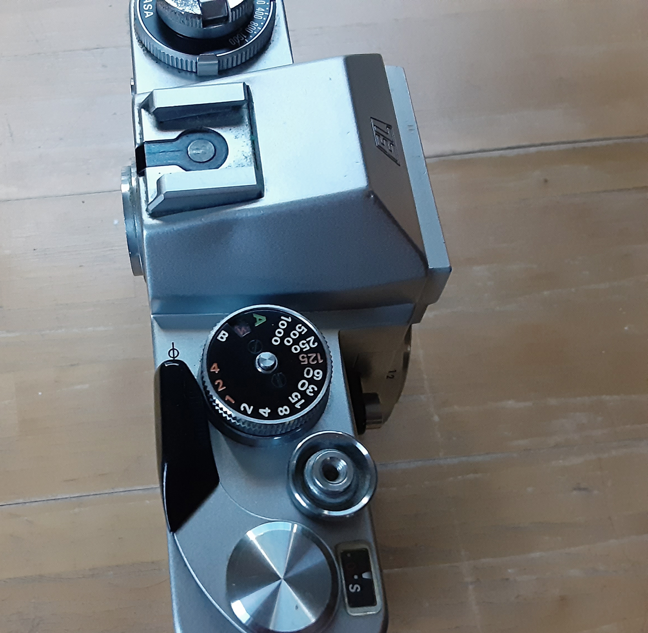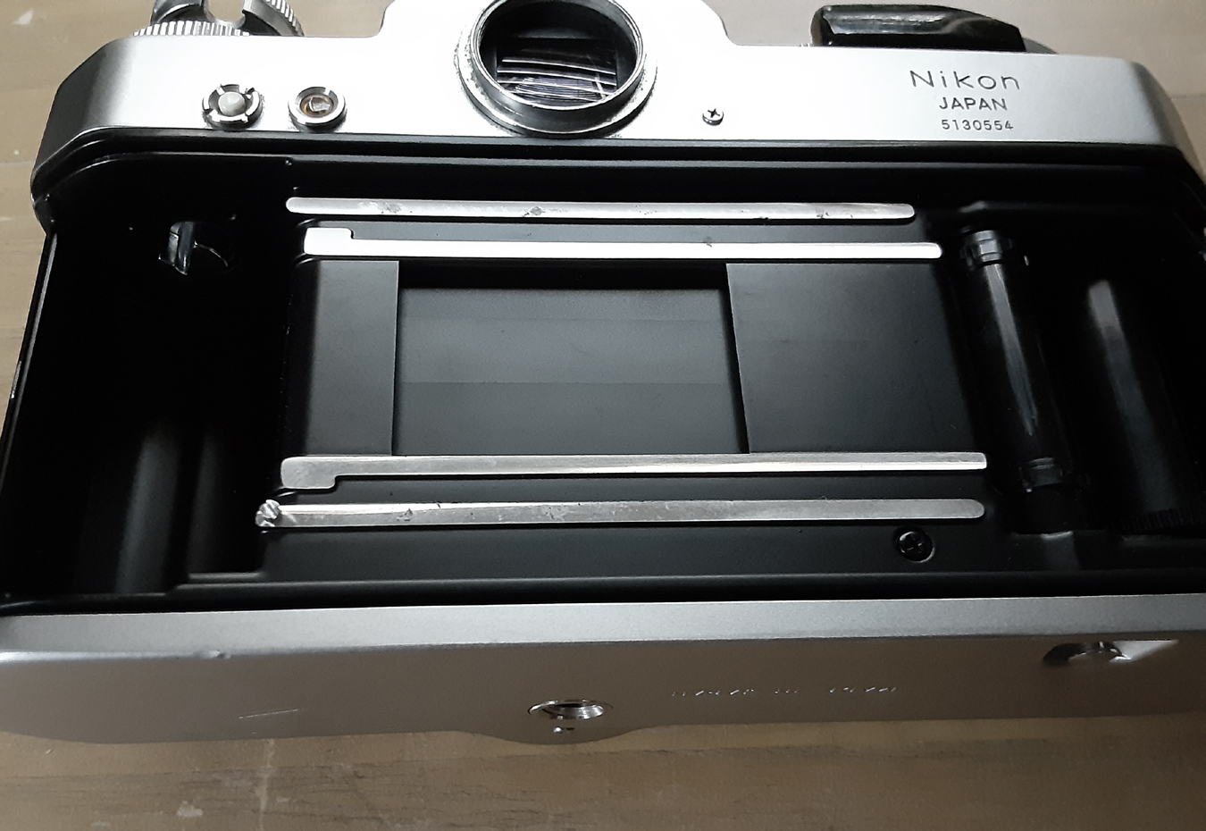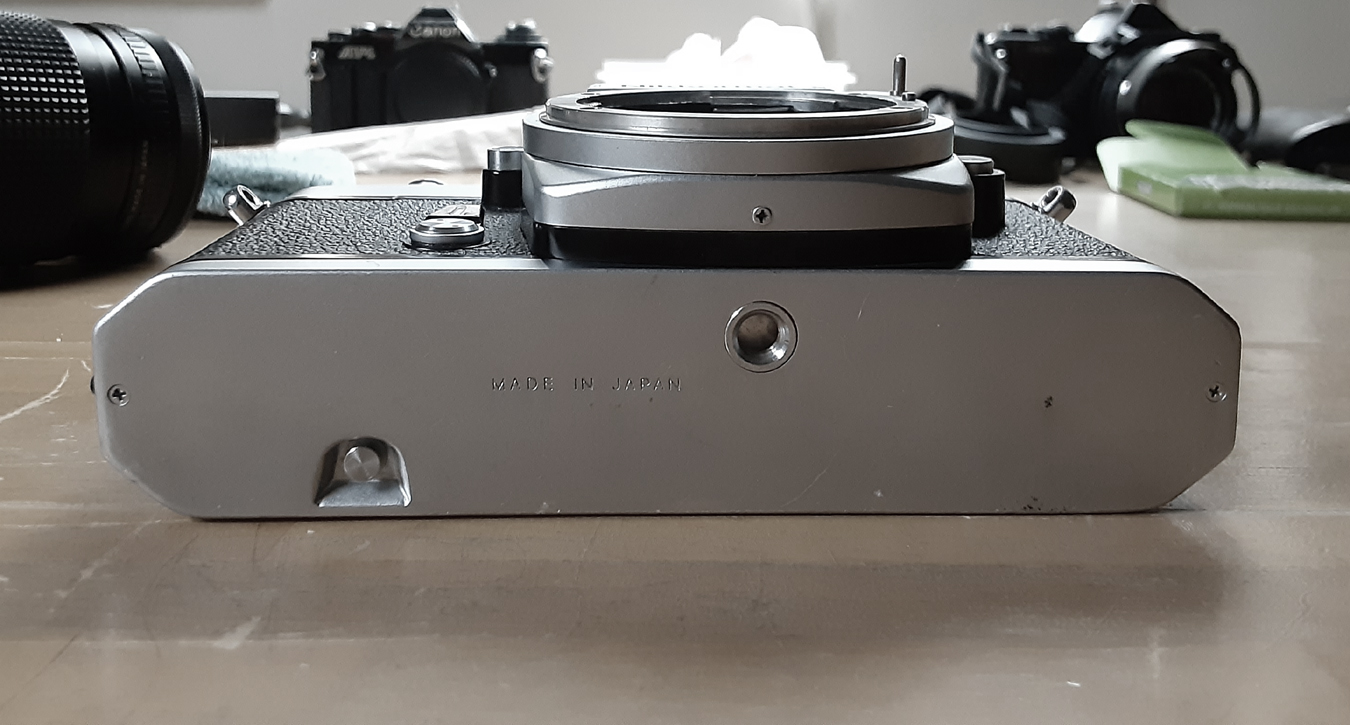 This was last serviced in 1982, which by Nikkormat standards makes it a recent service. There's a small dent on the prism and one half of the rewind knob is showing corrosion. Otherwise, an attractive and clean camera.