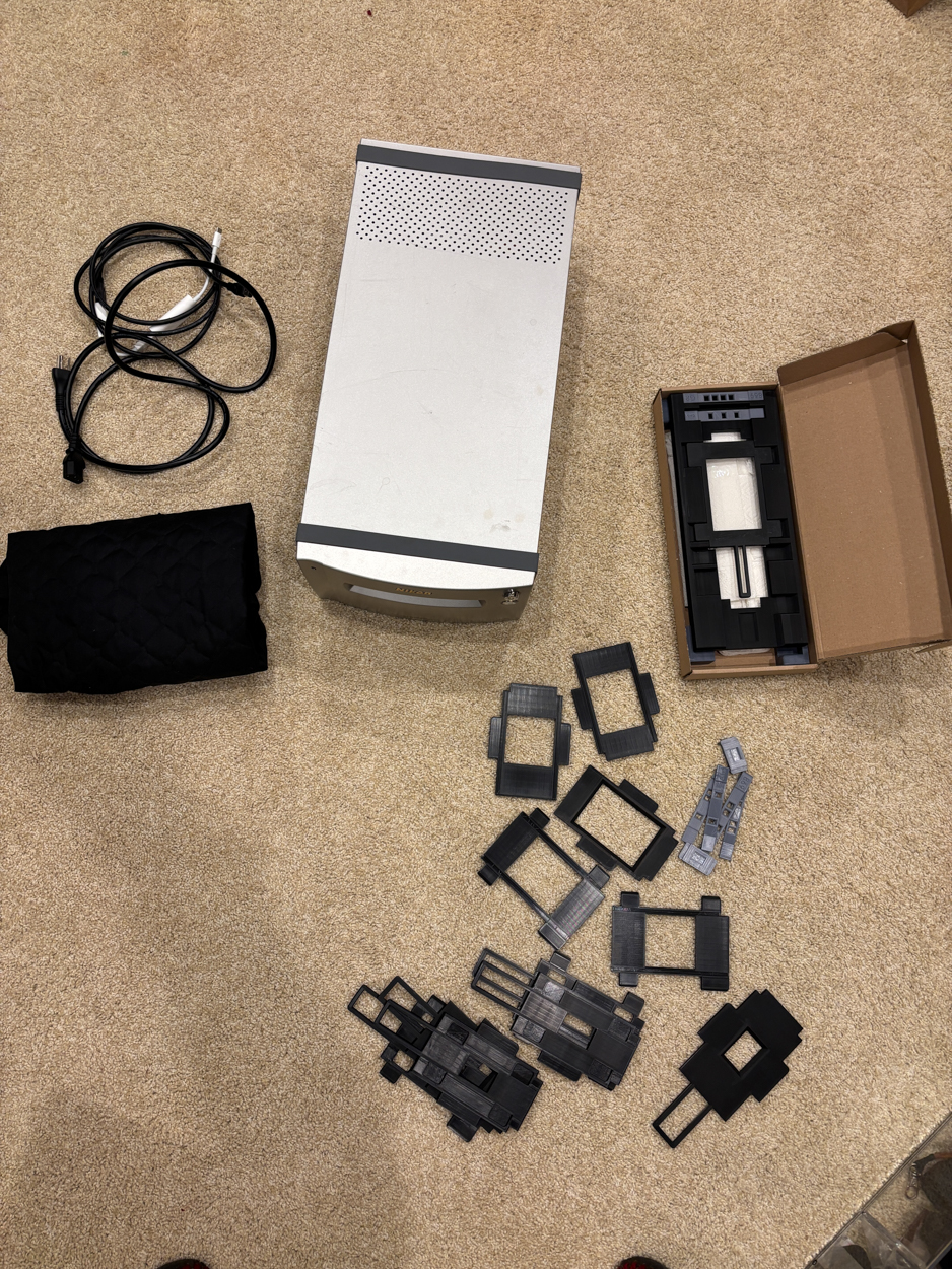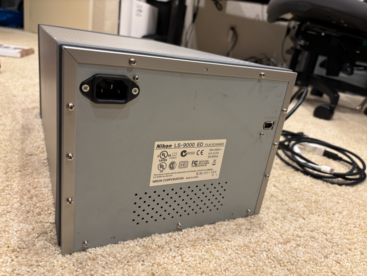 * Coolscan 9000. Bought around 3 years ago also from Mr Phillips. Works perfectly. I upgraded the film holders to Stephan Scharf's 3D printed versions. These holders blow the Nikon holders out of the water. It comes with the universal frame and top ANR mask good up to 6x9 film. Also included are bottom masks for 35mm, 6x6, 6x7, and 6x9 film. I will include as well a bottom mask for XPan frames - it's in a sealed box I ordered from Stephan but never opened, not pictured in the attached photos. Comes with a custom cover case, and the adapters you need to connect it to a modern Mac (thunderbolt). $2000 net to me.