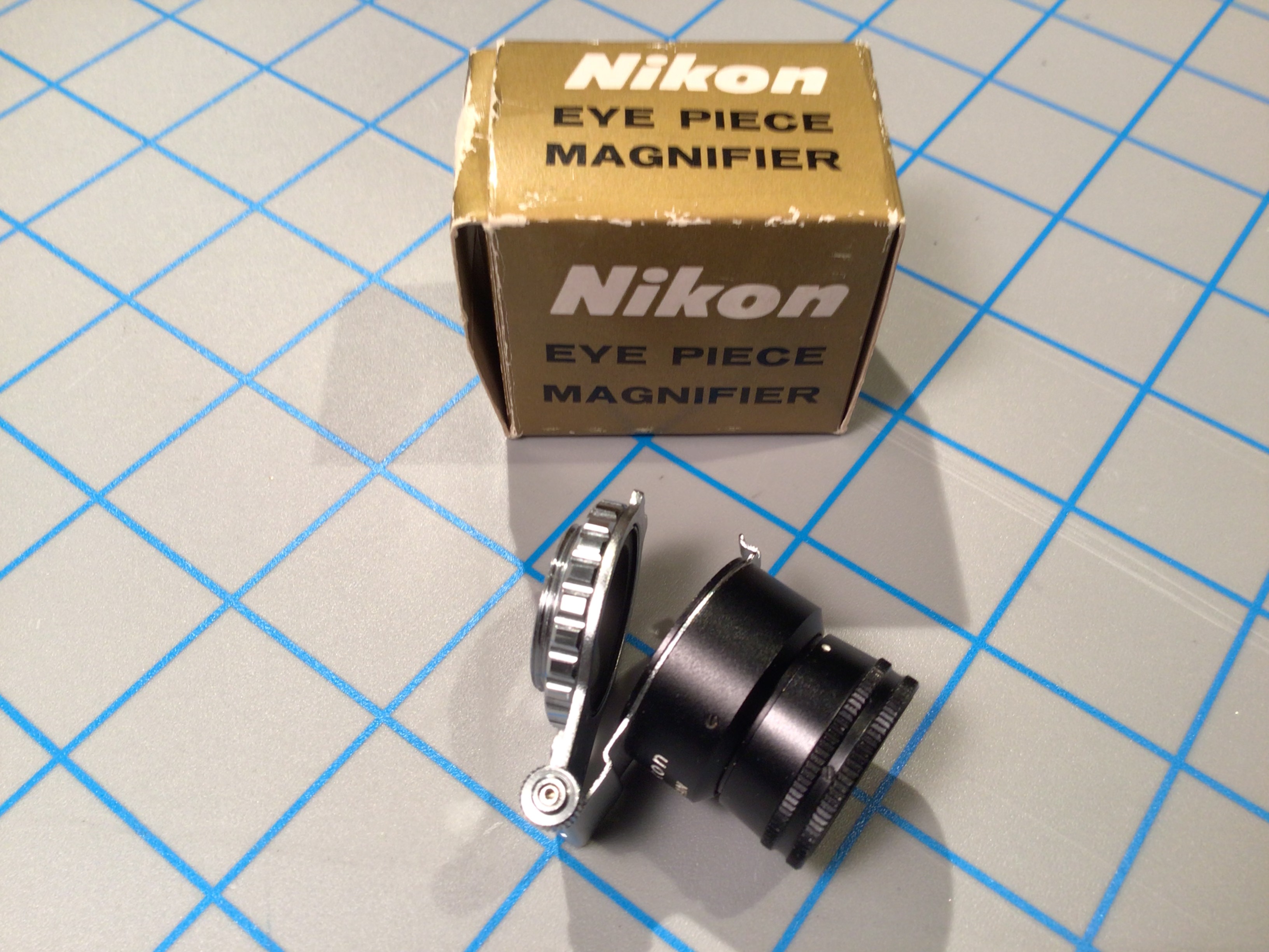 This device is out of the Nikon F era. It magnifies the viewfinder image 2X. It screws directly into a FTN finder and needs an adapter to screw into the Nikon F finder (see the adapter in my listing for the right angle finder). The original box and instruction sheet is included. $25, plus $8 shipping.