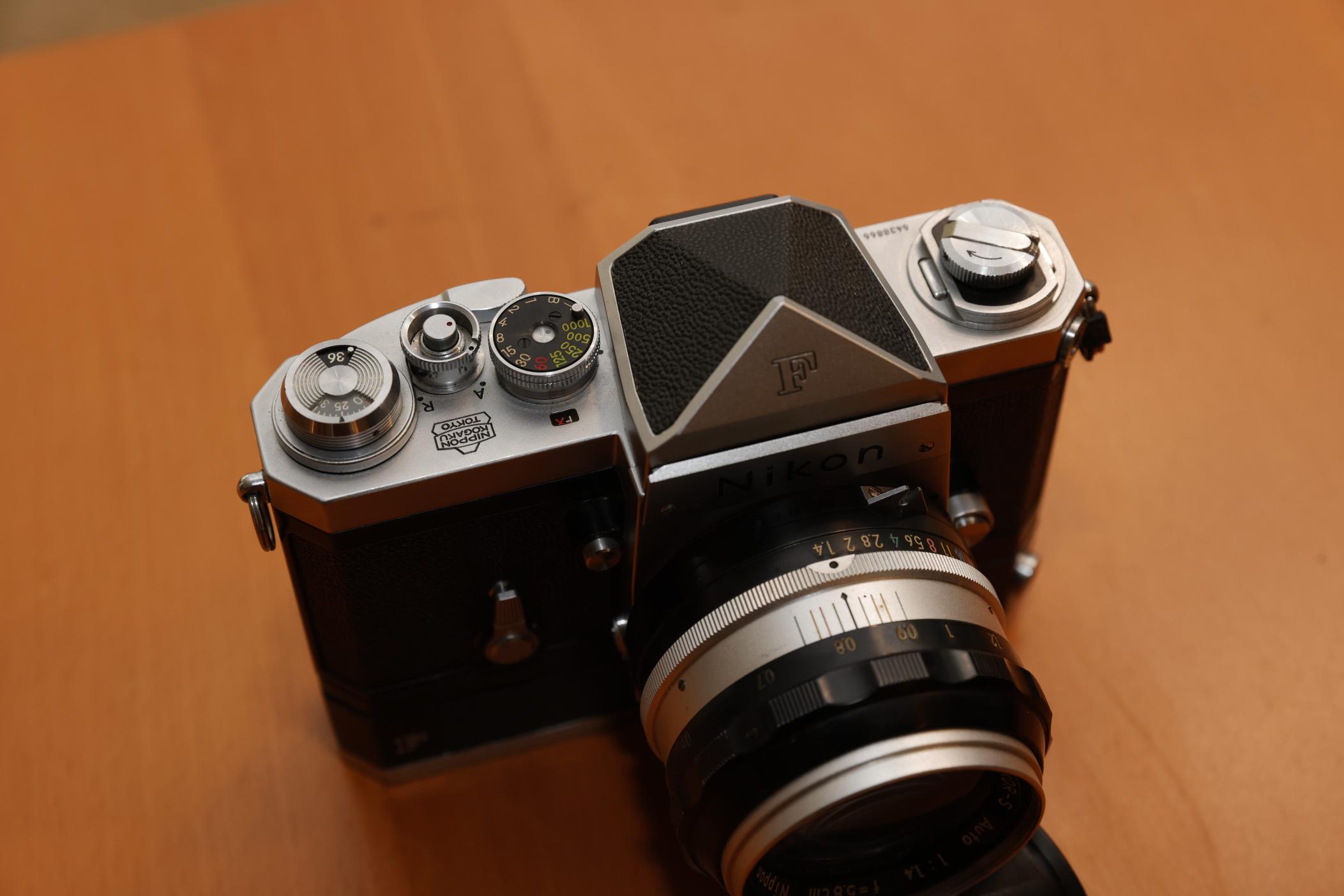 Hello! I am looking to sell my beautiful Nikon F with an f-36 winder, 5.8cm 1.4 lens, and eye level prism (a cordless battery pack and the connecting piece is also included but the battery pack is toast due to corrosion inside). The 5.8cm is clean optically but the barrel is dirty (could be cleaned). The camera is in great condition with zero issues whatsoever and has a hollow advance lever. The prism is extremely clean and clear but there are two dots of what I believe to be desilvering on the wall of the prism. these two dots are only visible if you remove the prism and shine a flashlight at it. This is the crispest and newest feeling Nikon F that I have ever felt. Asking $350 plus shipping. SOLD! (well, traded away) Thanks, Gram!