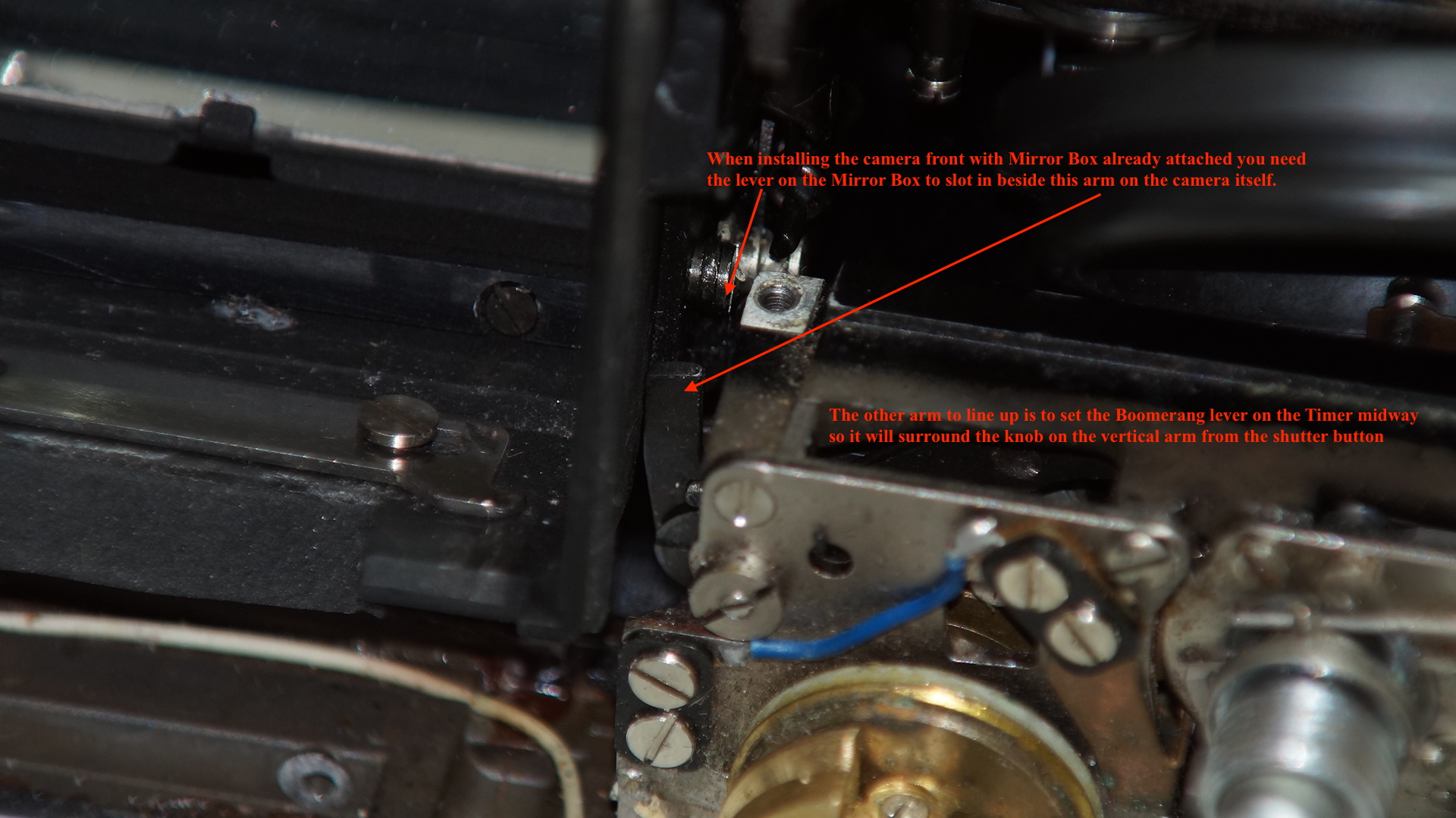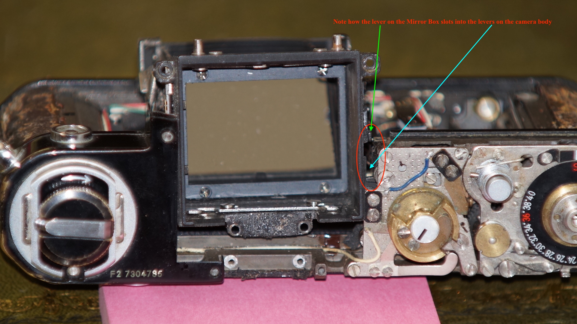F/ If the camera jams it means a lever somewhere was not in the right position. Remove the bottom panel and trip the shutter with a toothpick on the lever shown in the photo. Then check that all the levers in the camera body and on the side of the Mirror Box are moving freely. Realign them and try installing again. It may take a couple of goes but it will drop into place when all the levers are lined up. After all someone on the production line could do this first time every time back in ’72.