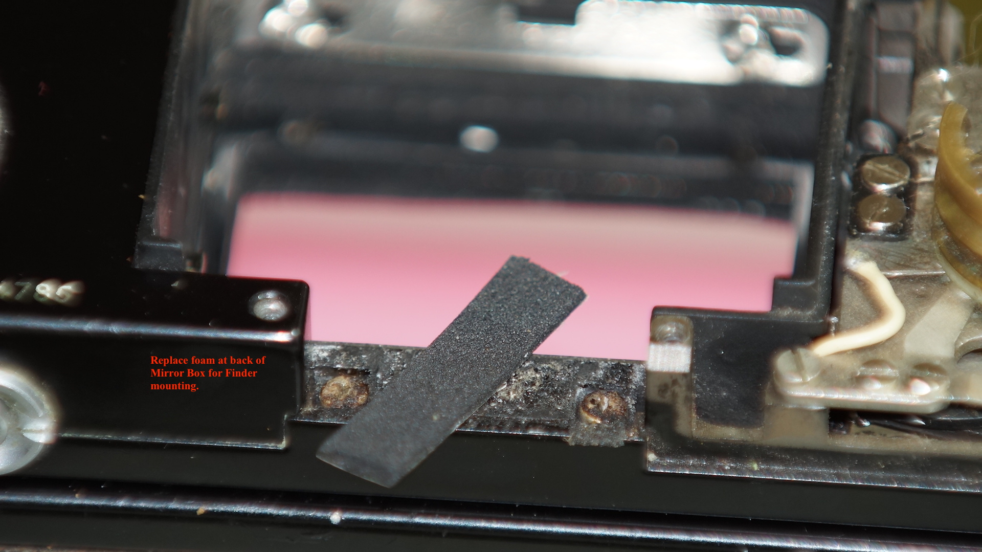 On the rewind side of the Mirror Box there is a shock absorber spring. From the marks left it looked like there used to be a foam pad under the spring. I fitted a piece of light seal foam and this made a big difference to the metallic ping sound when the camera was fired.