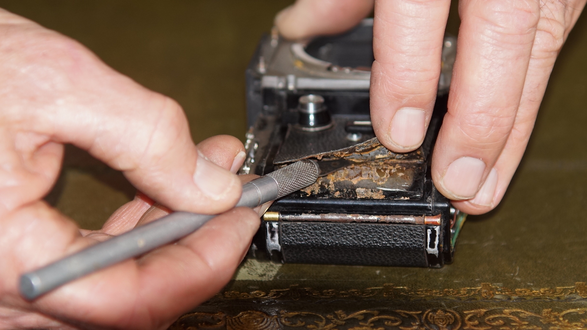 B/ On the film advance side carefully pull back the leatherette till the first 2 screws can be accessed. I use a partially blunt craft knife to carefully cut away the glue. On the rewind side completely remove the leatherette.