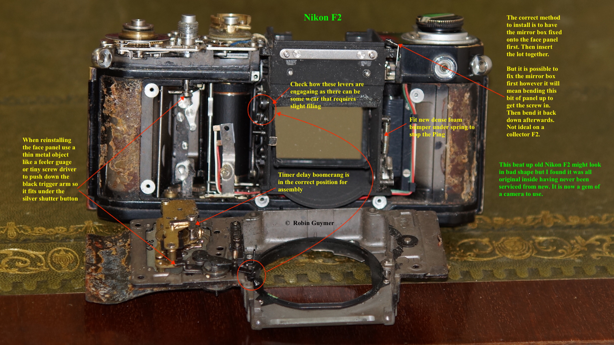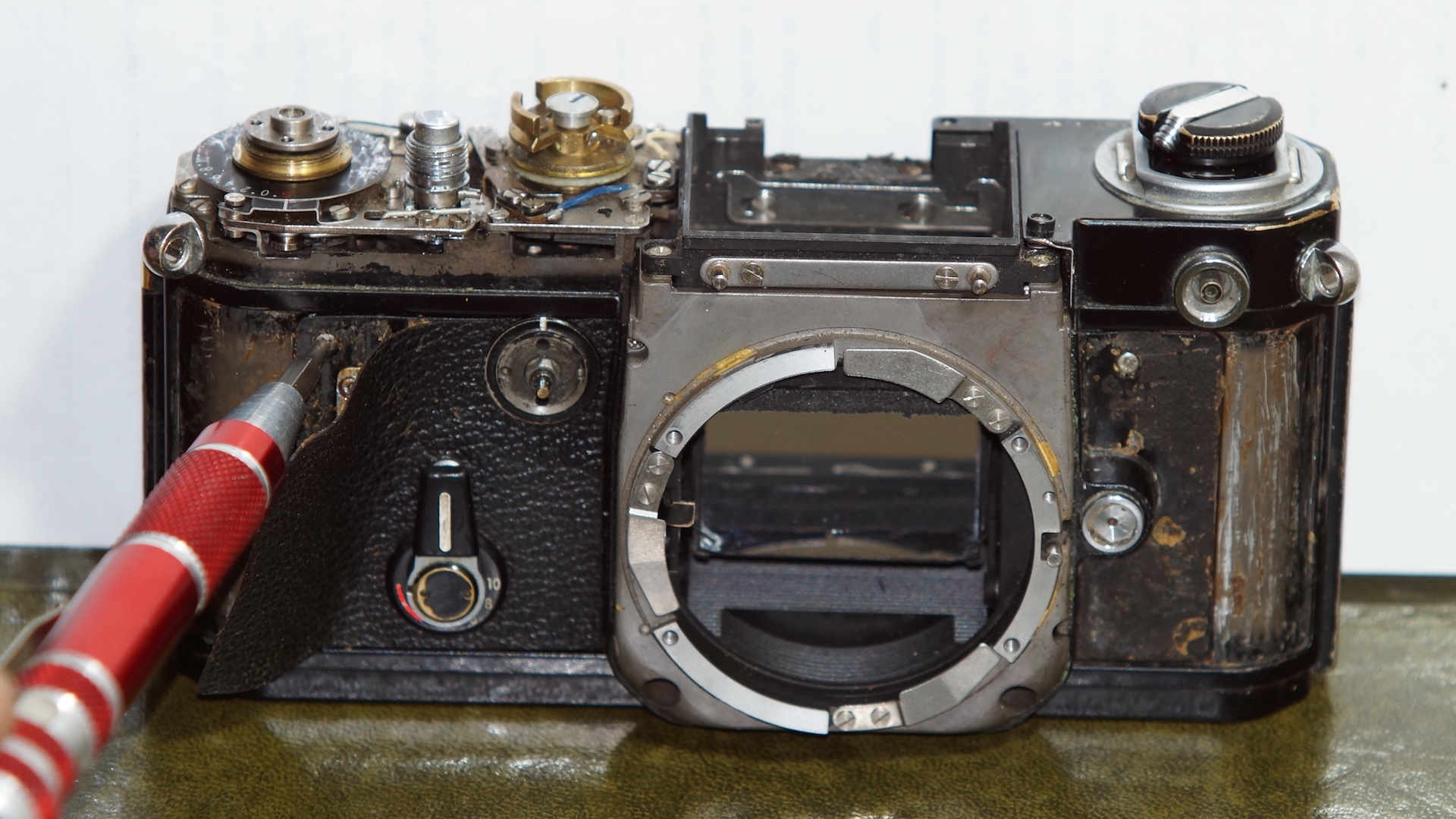 I eBay purchased an old beat up F2 for less than a carton of beer. It was jammed, the Finder dismantled, shutter crinkled, rusty, dusty, no power to the finder - basically a basket case. So a good project to see if I could get it working again, which I did and successfully. Unable to find much info on the Net beforehand, I have documented how I went about this and what repairs I undertook so that other DIY camera collectors will see that this is not such a daunting job. My hope is that other collectors will contribute, suggest, guide and correct, so that these fantastic old cameras can keep on keeping on long after the few remaining experienced service people have closed shop.
