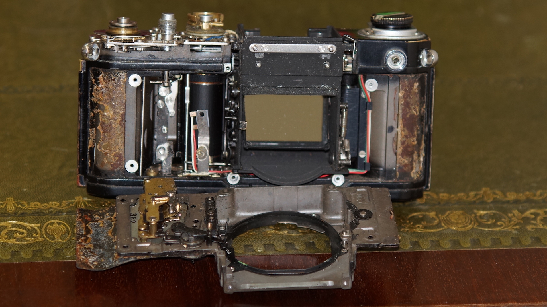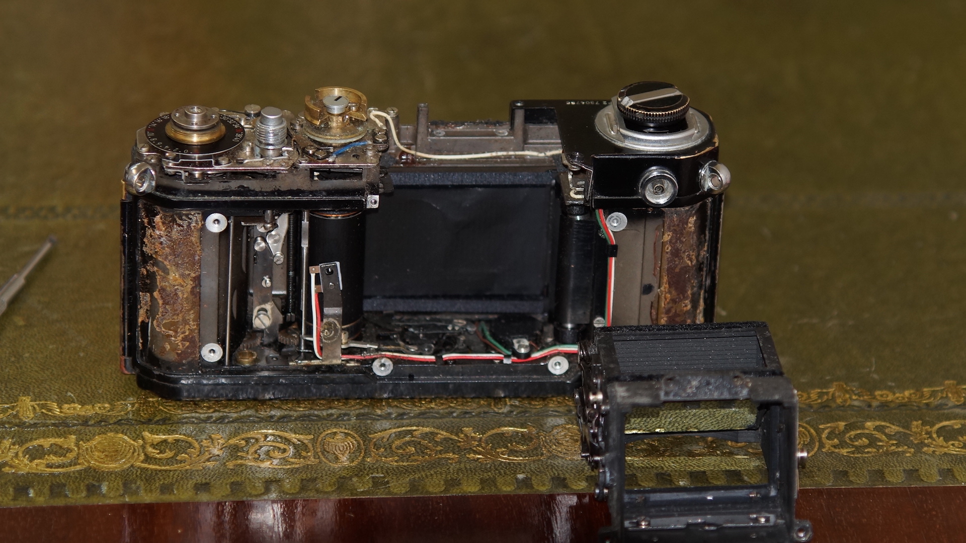 The rear door light seals were removed - well there was only the remnant dust actually. Replaced with new. The upper mirror bumper and side foams were replaced. The mirror came up like new using a digital APS-C sensor swab and carefully picking out the dust spots under a magnifier brought the split prism glass into quite an acceptable state.