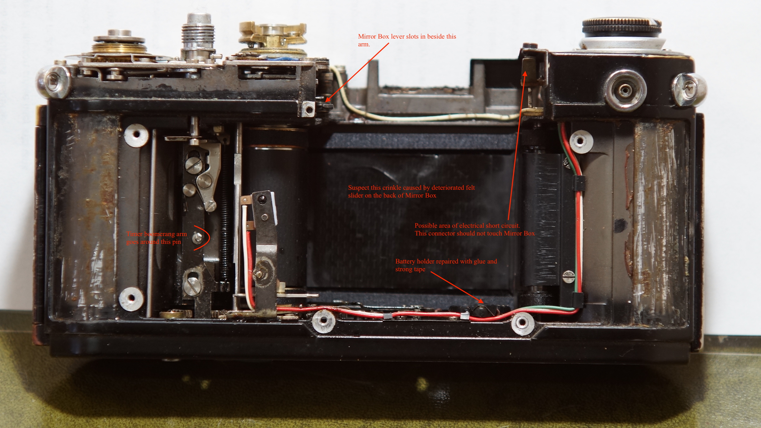 At the back of the Mirror Box are two strips of felt that sit against the top and bottom of the shutter curtain. The top felt was damaged and this had caused the shutter curtain to snag it and then crinkle (by previous owner). I removed the bad felt and replaced it with new.
