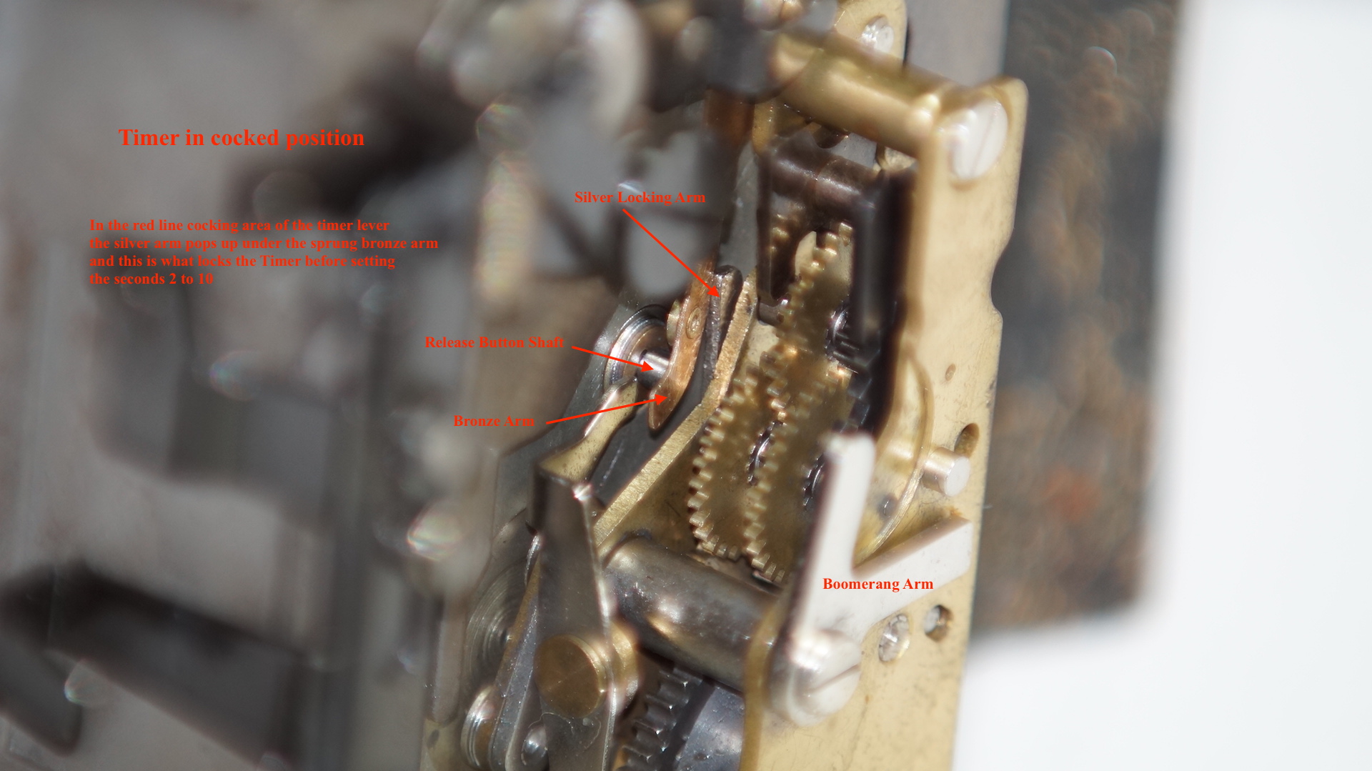 Of course this was not working. Made the mistake of spraying it with Dry PTFE. This did get it running freely but it would not lock in position. Then made the mistake of trying to bend the small levers into the right position to get it to work. Took me a few hours to get the lever back into the original position. Finally figured out how it all worked under a magnifier. The locking bar does not like any lubricant as it maybe grabs the shaft by friction. So a few drops of lighter fluid got rid of any oil and the small lever started to grab the shaft and lock it in position. Lets call this the friction bar and this grabs the shaft in the first instance as the external arm is in the red line zone. Then other locks seem to work with this to catch the timer at the 2 to 10 second intervals.