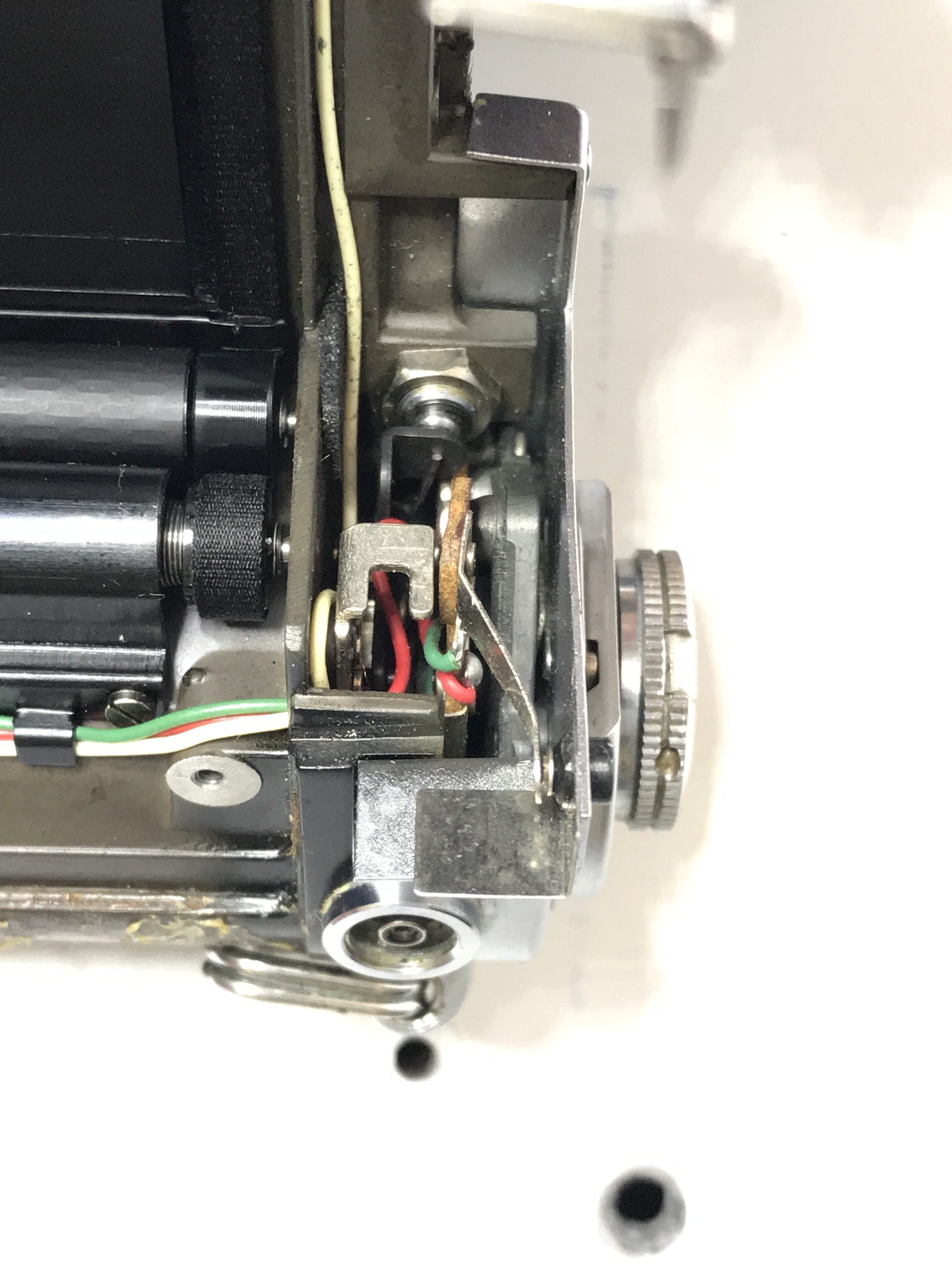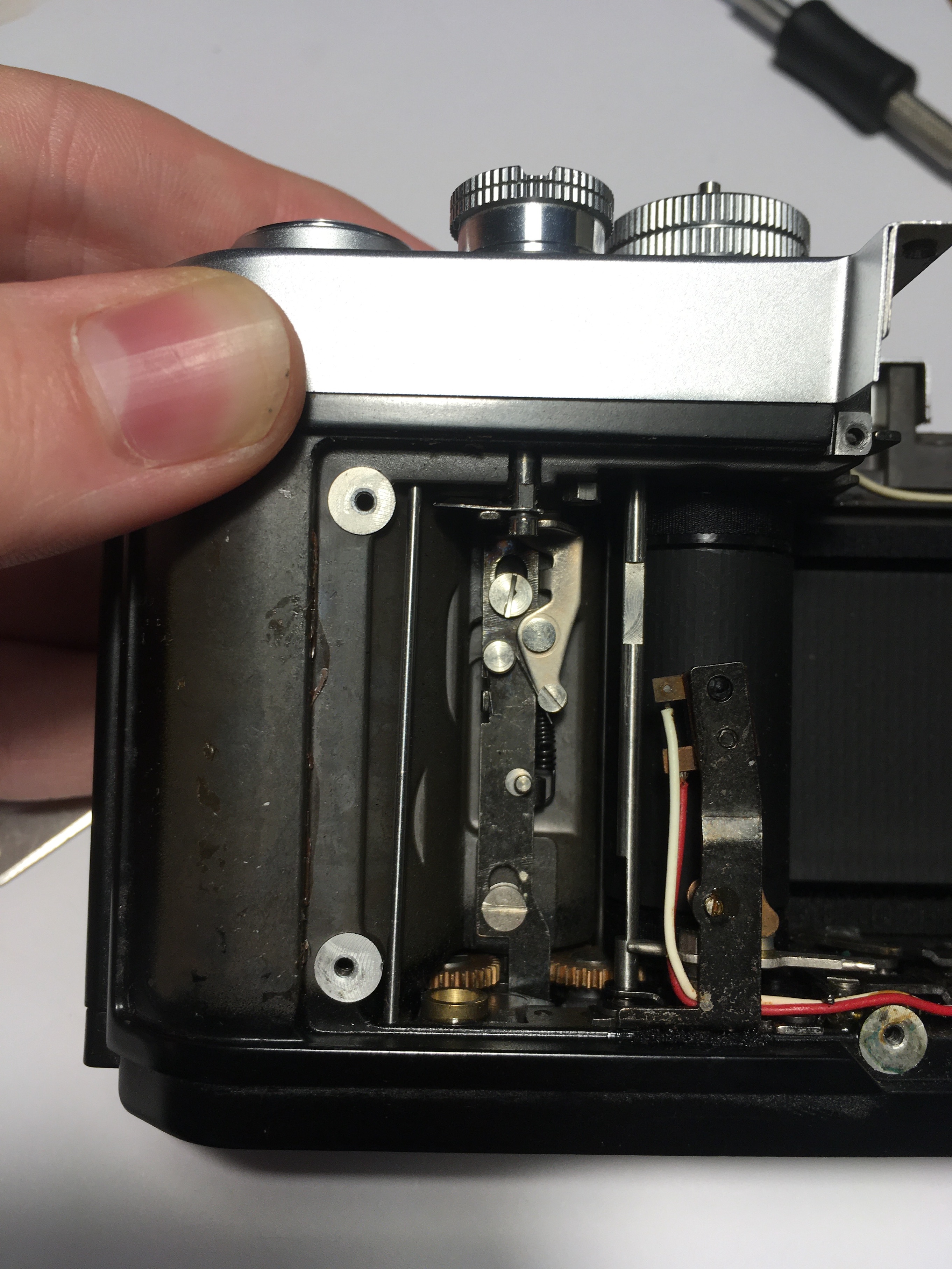 Hi - I took my Nikon F2 apart to repair a corroded contact on the battery compartment, but unfortunately now I can't get the camera back together.