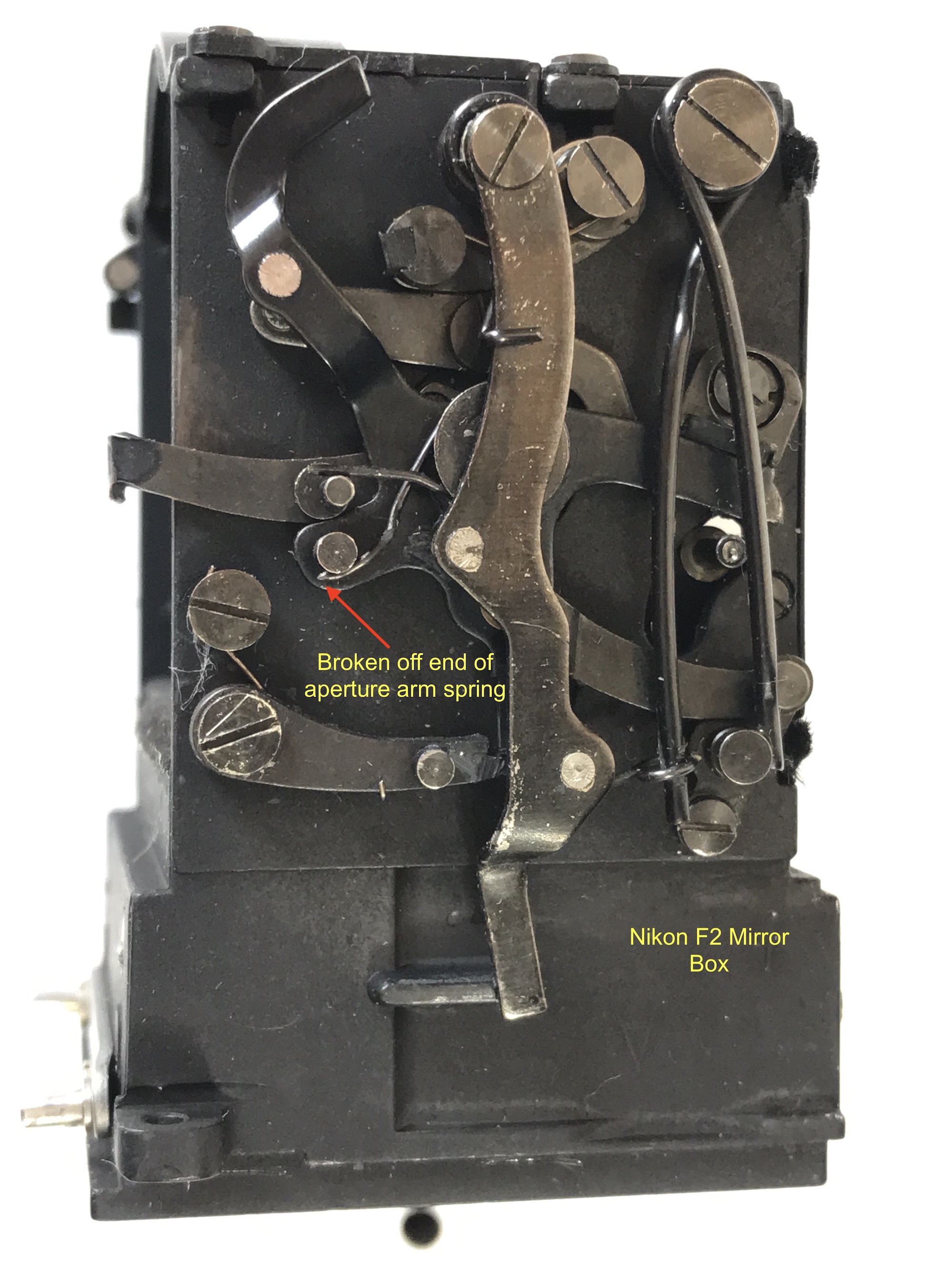 I have had more trouble with my silver F2 as the Aperture Arm stopped working. When I had the black F2 dismantled I never took a good photo of that side of the mirror box. It was hard to find one on Google but eventually did on an eBay image that gave me an idea of what the spring looked like. The spring on the silver F2 was dislodged and the end broken off it maybe from metal fatigue or it had jumped off and got mangled. I managed to get it back into position and it looks like it should hold but to make sure I added some thin wire insurance. Seems to be working okay now. I know it looks a dodgy fix but hey whatever works!
