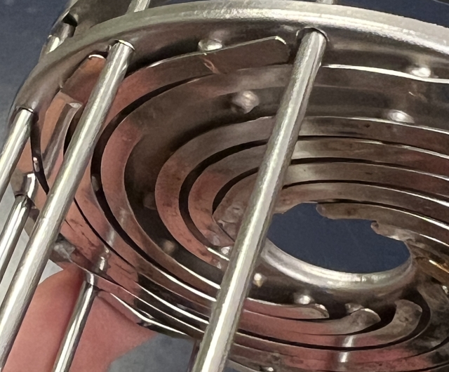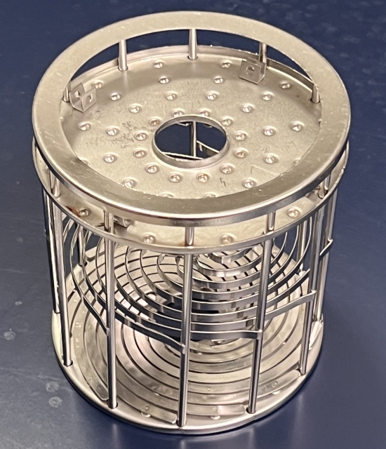 For sale is a reel for a Nikor 4x5 film developing tank that needs some help. The top-plate screws are missing, as is one spiral from the top plate. One end of one spiral on the bottom has come loose, as has one of the vertical support rods around the frame. If you replace the stainless screws it'll be usable as-is for fewer than 12 sheets, a big rubber band around the outside works just fine to retain the film. Repair should be straightforward for anyone who can cut and do small tack welds on stainless steel. I've never bothered my machinist friend about it because I don't want to use up favors repairing things I don't really need. Asking $25, little more than the cost of shipping, via PayPal goods and services shipped in the US.