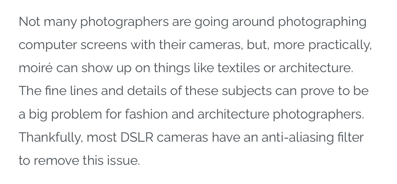 Back in the ‘dawn of digital history’, sensor resolutions were much lower and wars were fought between photographers who loved their super sharp images full of false detail and who considered moire a small price to pay for inaccurate but sharp recording and those who preferred a more accurate but softer and apparently less detailed image. The last point is important - the images produced with an AA filter were generally more accurate as they did not contain false detail. Anyway, because of the Internet, the sharper is better crowd won and the manufacturers have us cameras without AA filters (Leica had to anyway as any extra glass in front of the sensor messed up the image from short back focus rangefinder lenses).