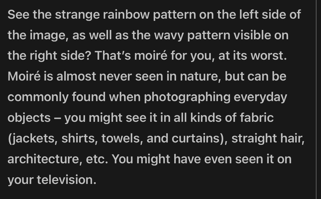 - when I had the Leica M9 colour moire was actually quite a common problem. 18Mp and a Zeiss ZM 2/50 were sharp enough to cast 🌈 over roofs and clothes on a fairly regular basis. It was basically impossible to deal with nicely.