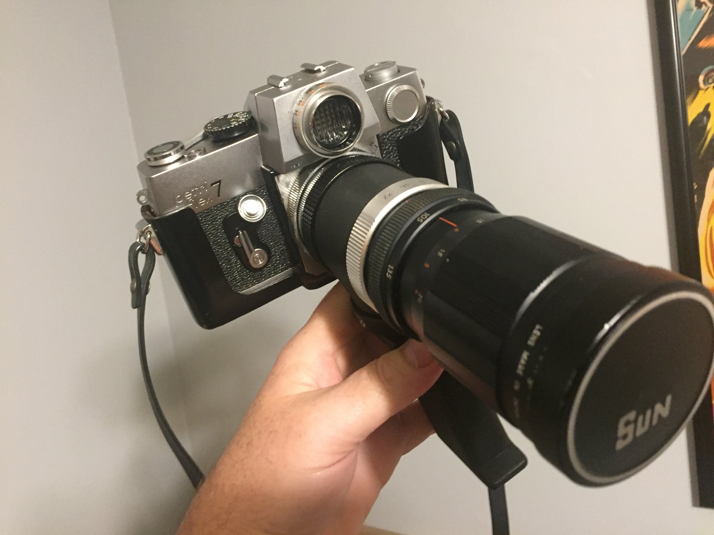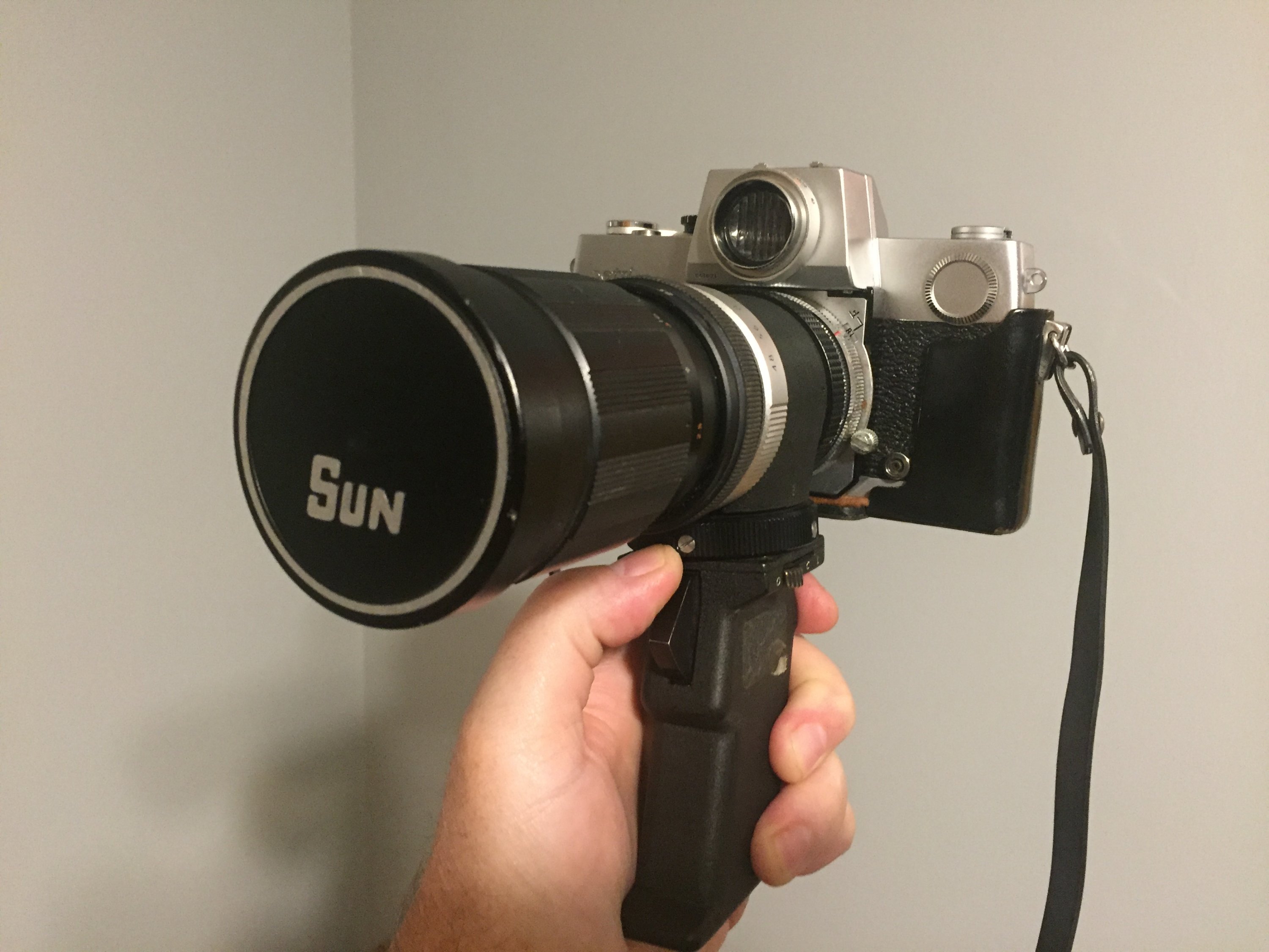 Sun "Hi-Tele Zoom" 80-210/f4.8 preset zoom with pistol grip, fits M42 screw mount. Nice condition, clean glass and focuses smoothly. Pistol grip preset takes some getting used to, and this lens is all-metal so it is heavy by modern standards. FREE if you pay postage. Fits into USPS flat rate box. More pics available on request