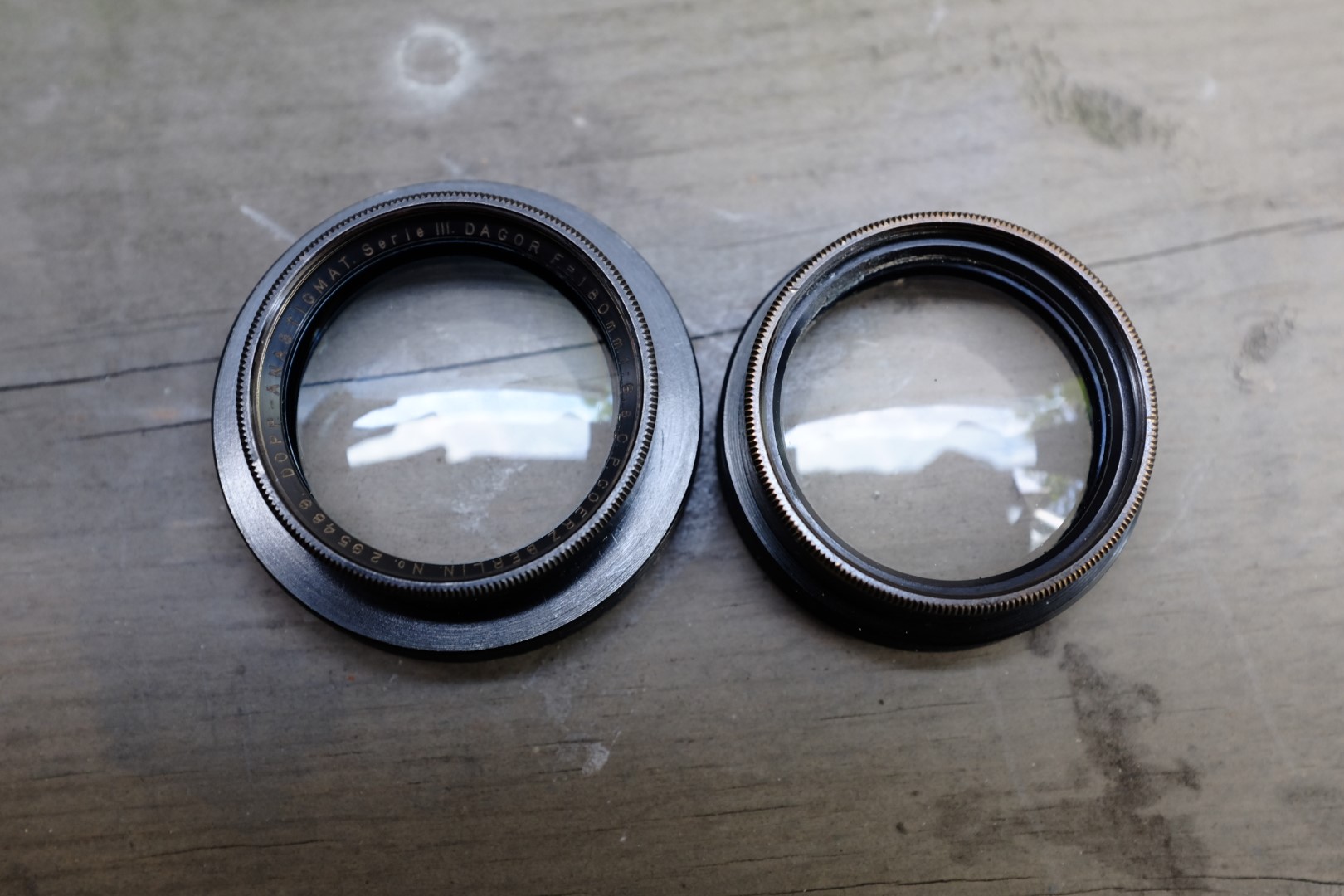 DAGOR 180mm f6.8 (C.P. Goerz Berlin Doppel Anastigmat Series III) lens cells with custom no.1 shutter thread adapters. Minor smudges on the rear surface. Never tested. 40 CAD sold