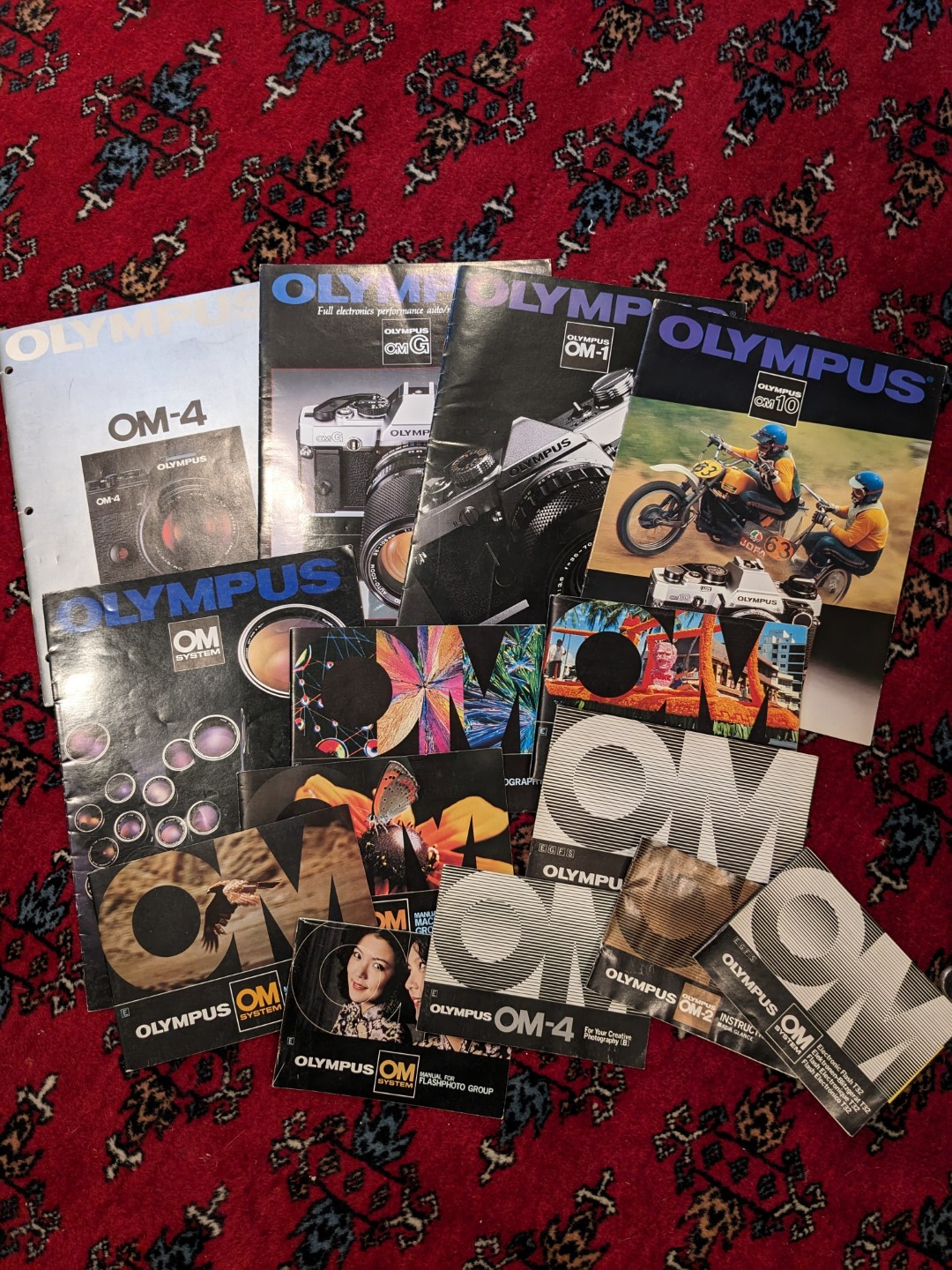 BIG PILE of Olympus OM literature in great shape (3 in French). PWYC sold