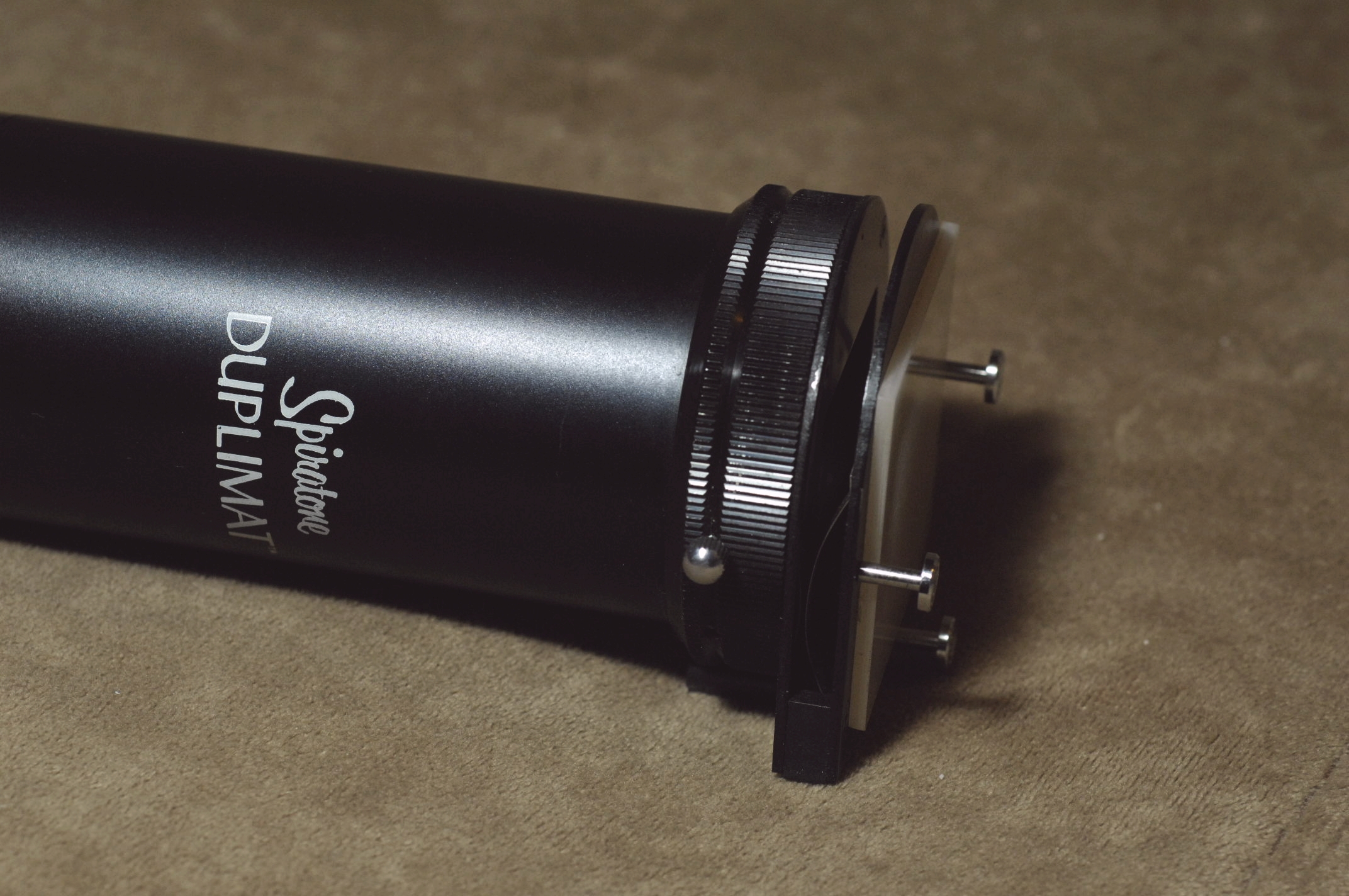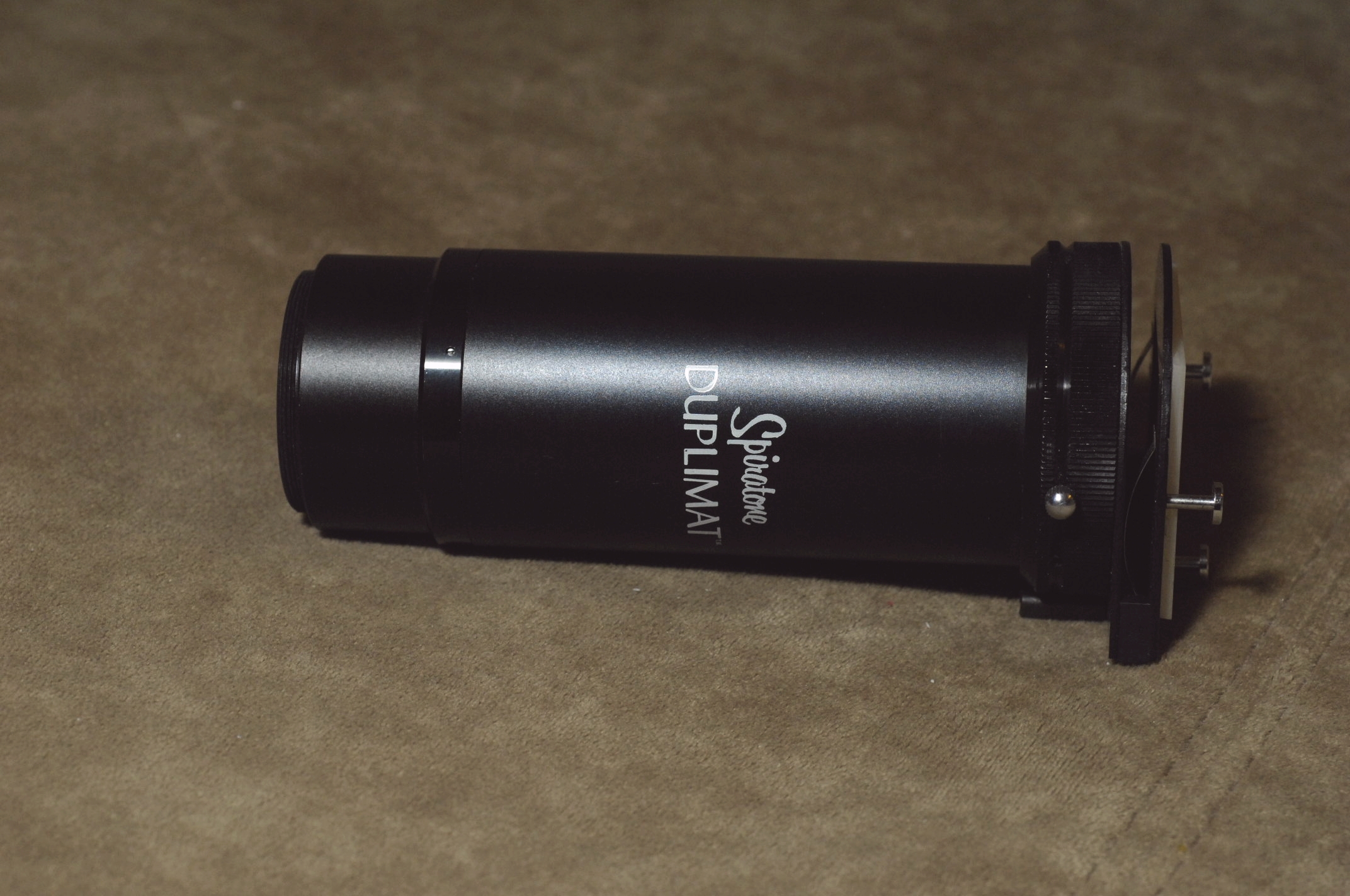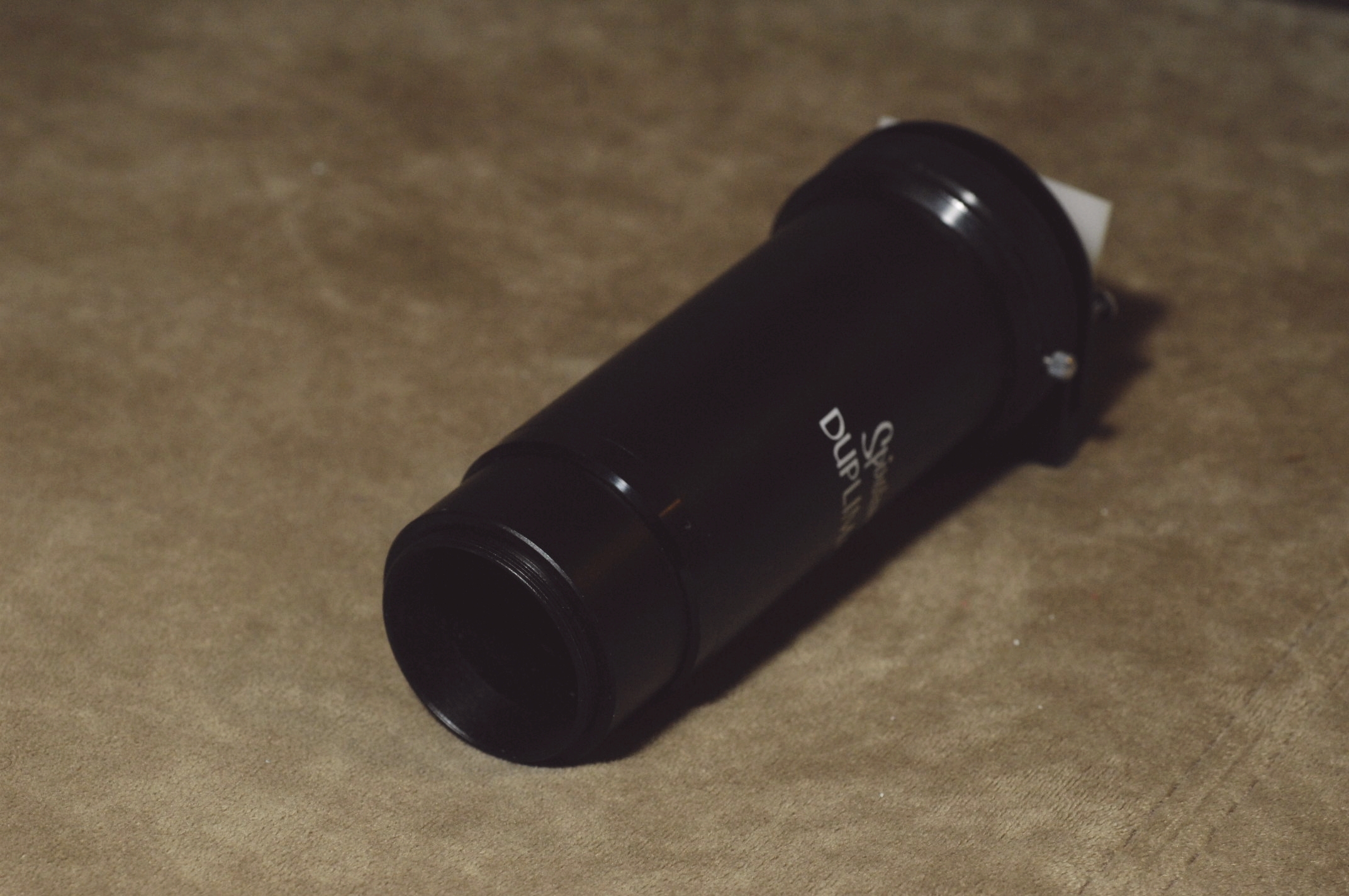 1) A Spiratone duplimat slide duplicator for sale. This unit is designed to make 1:1 slide dupes, internegatives of interpositives from 35mm originals. It is pre-focused and has a fixed aperture. It can be fitted to any 35mm SLR camera by means of a T-mount adaptor for your particular camera. No caps or adaptor is included in this sale, but I have seen the T-mount adaptors for sale on eBay.