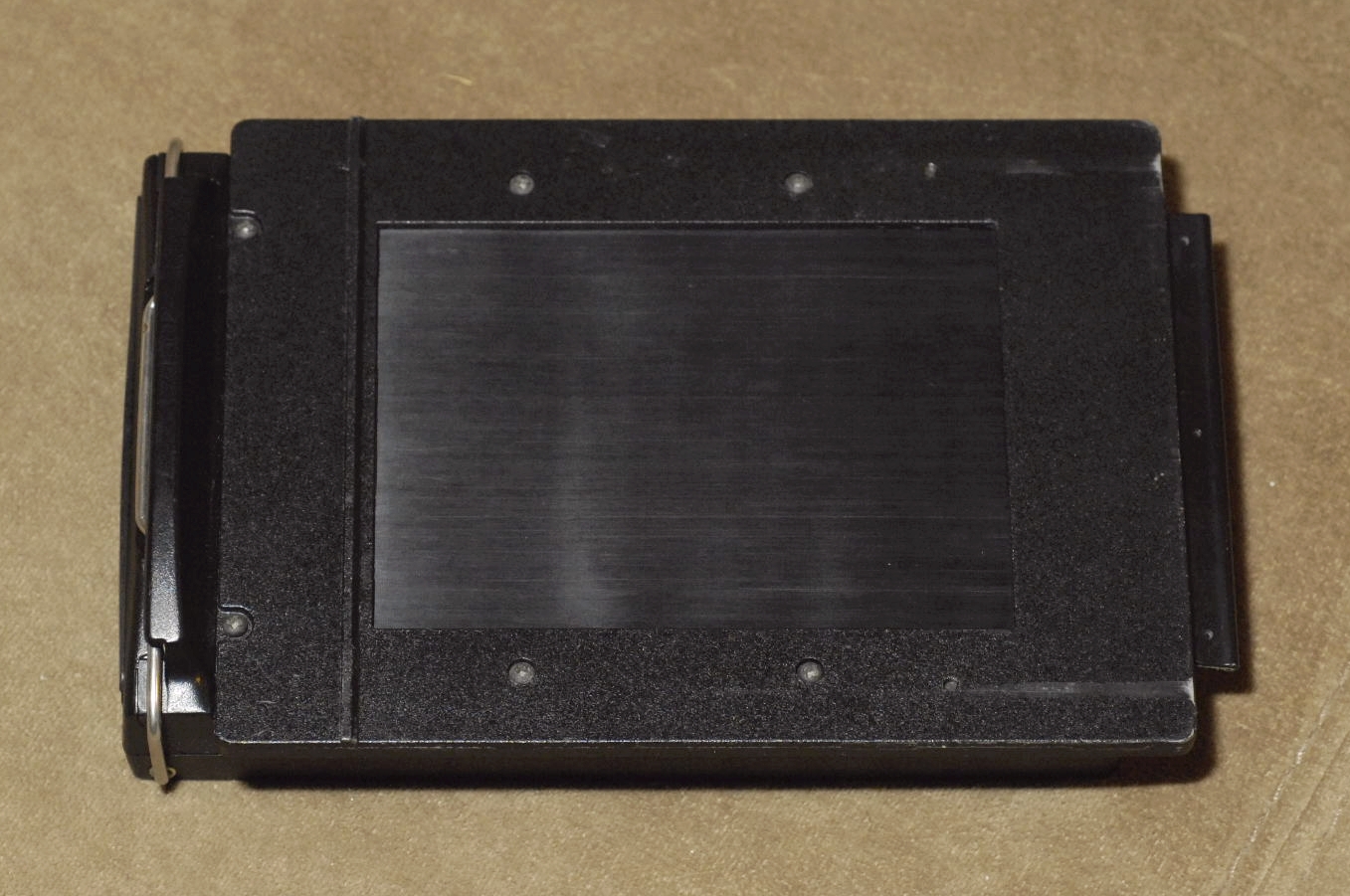 The back comes with the original packaging, although the box is worn and a bit soiled. Also included are two of the templates used when the back is mounted on a 4x5 camera, the instruction booklet and a cold clip.