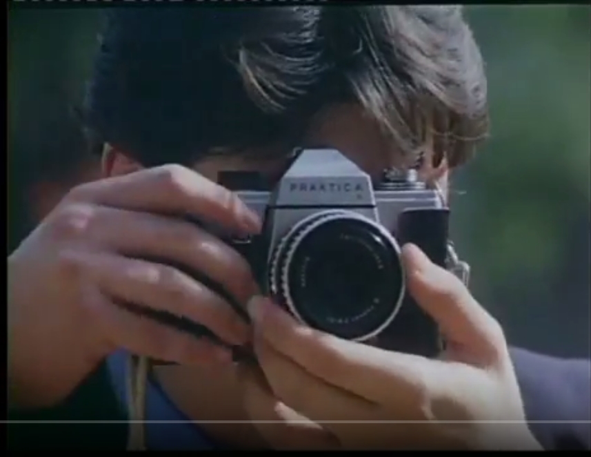 The camera pictured in the movie relating to the viewfinder view is a Praktica SLR - here's a screenshot moments before. However, I'm not sure if the viewfinder image truthfully represents what one would see in the viewfinder of that model. At least the actor seems to know how to properly hold and operate a camera, which is not always the case when cameras appear in movies.