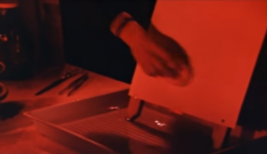 In his private darkroom he does an enlargement by projecting onto paper on the ground and processing by sponge with the paper on a board standing upright in the tray: