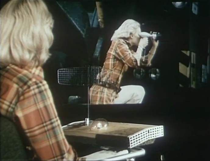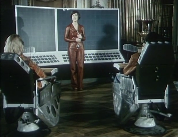 The microwave antenna makes part of the chairs of a panel. Though it is not related for what use. In any case when a panel member has a movie of his srceened the antenna is rotating. Likely a kind of early bluetooth...