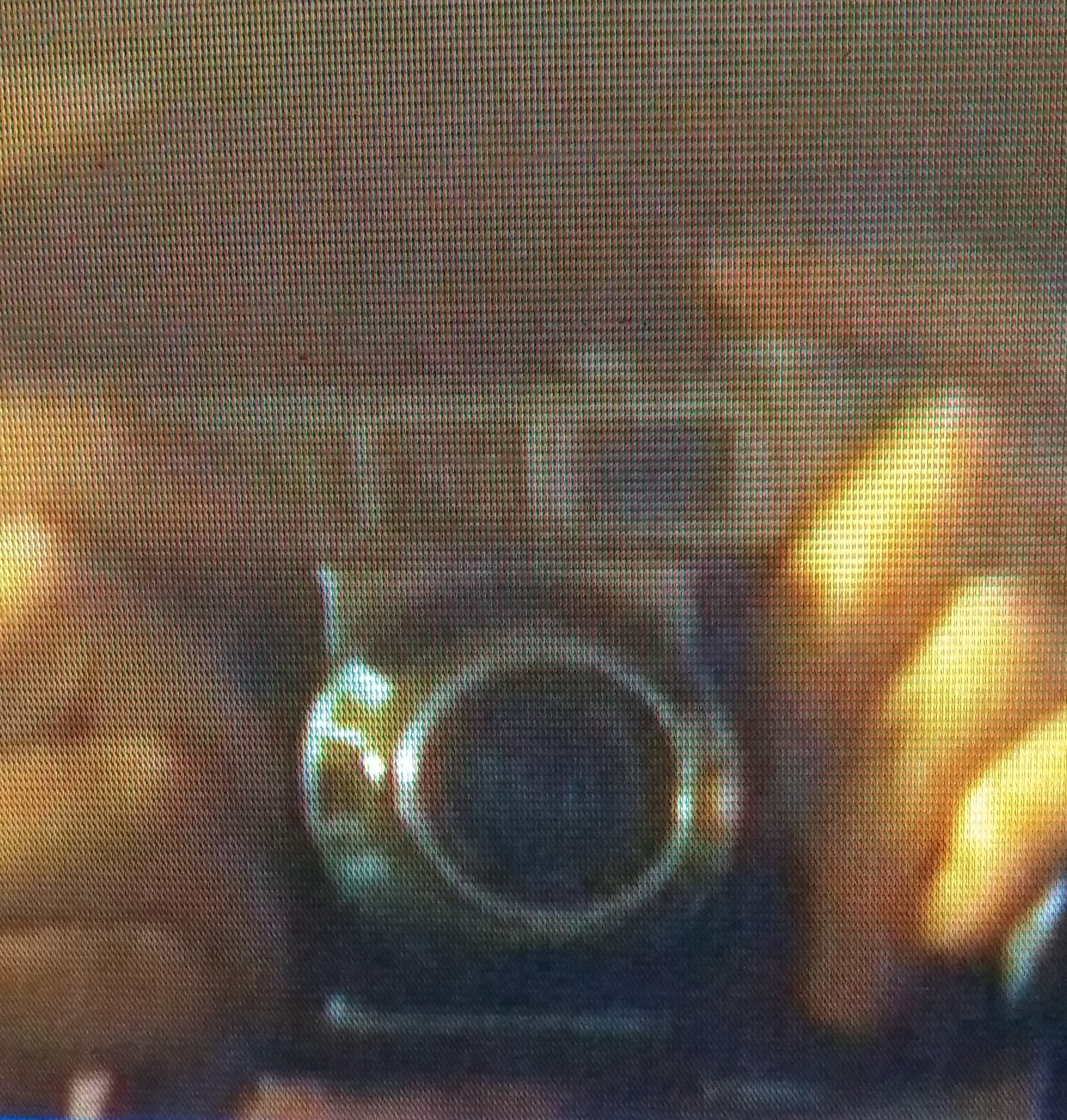 There appear to be three windows or sections at the upper front of the camera and there seems to be a metal latch of some sort beneath the lens.
