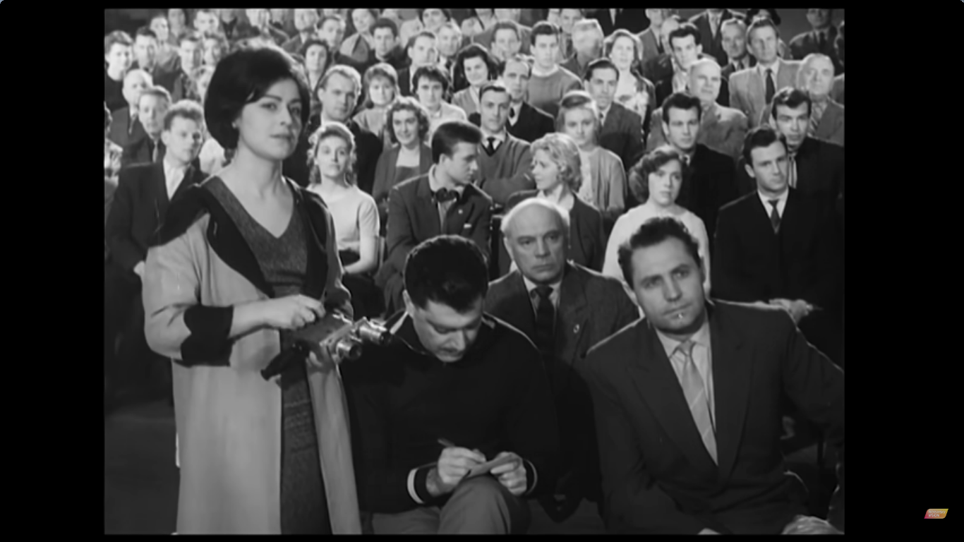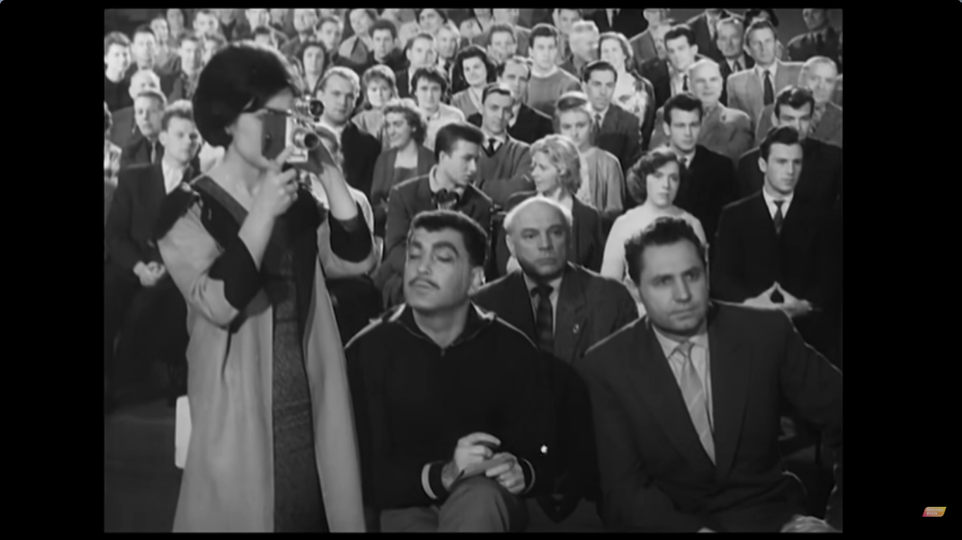This from Perry Mason season 4, episode 10 (1959), The Case of the Loquacious Liar. No idea what the camera is. Medium format rangefinder of some kind. Where her right middle finger is where she "tripped" the shutter, if that's really where it is.