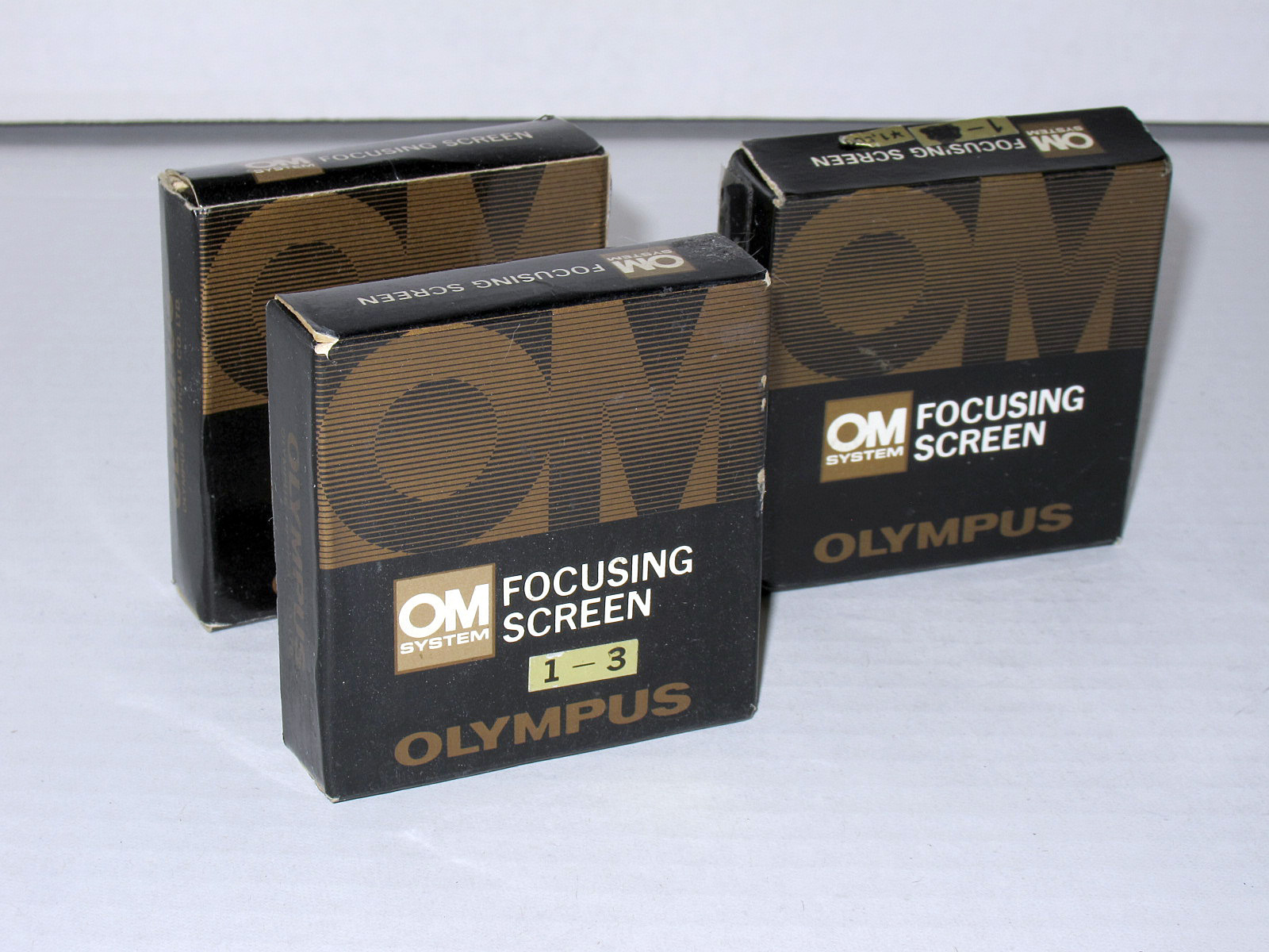 I no longer have any single digit OM cameras, but I'm left with three focusing screens, one 1-3 [Horizontal Split Image Rangefinder on Ground Glass] and two 1-1 [Microprism Circle on Ground Glass]. All are boxed and in cases, and the 1-3 has an instruction leaflet. All were bought used, and the 1-3 box has the KEH inventory sticker; all are clean and unscratched. Shipment via USPS First Class, CONUS only, please. Images attached.